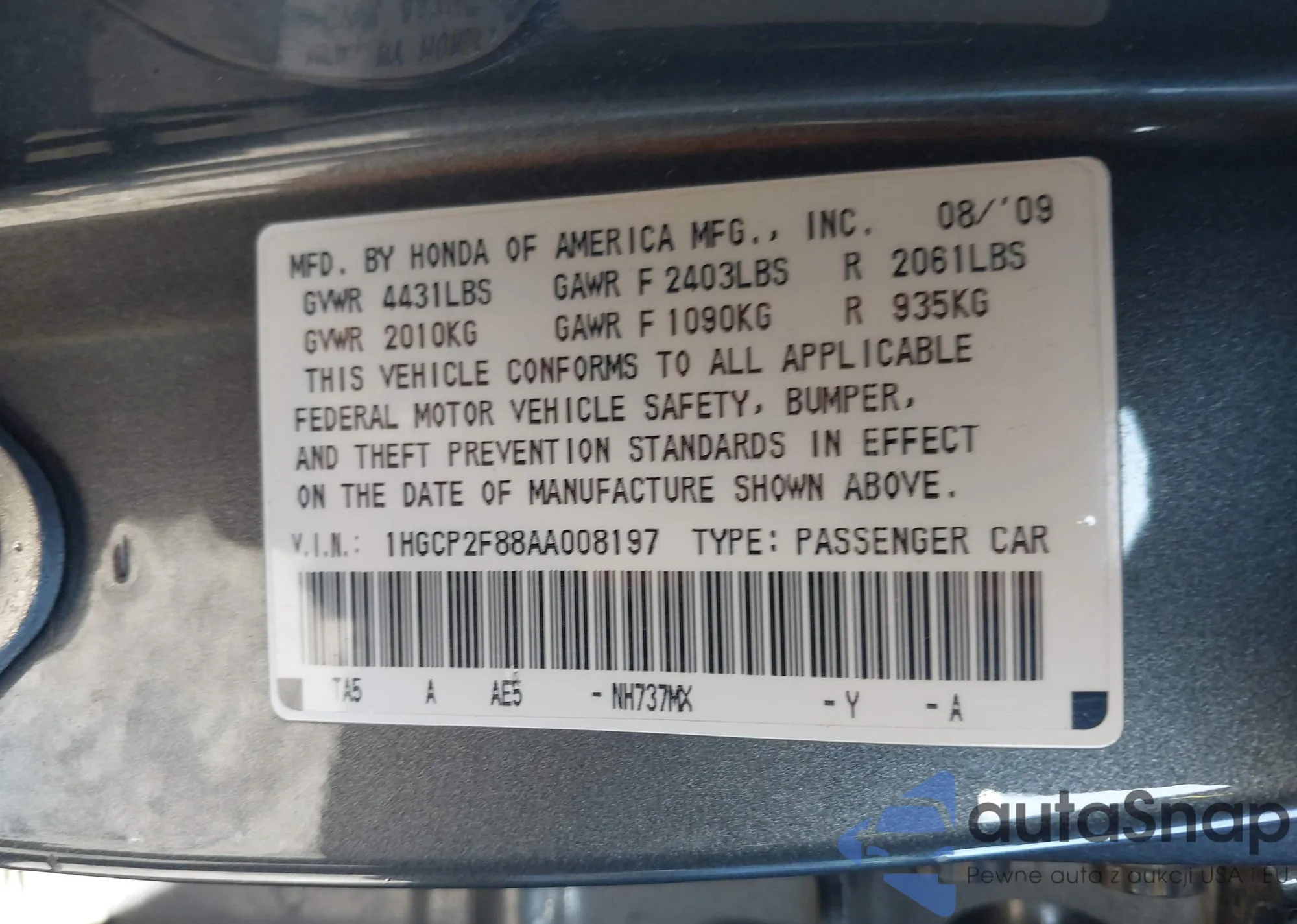 LOT: 43661303 VIN: 1HGCP2F88AA008197