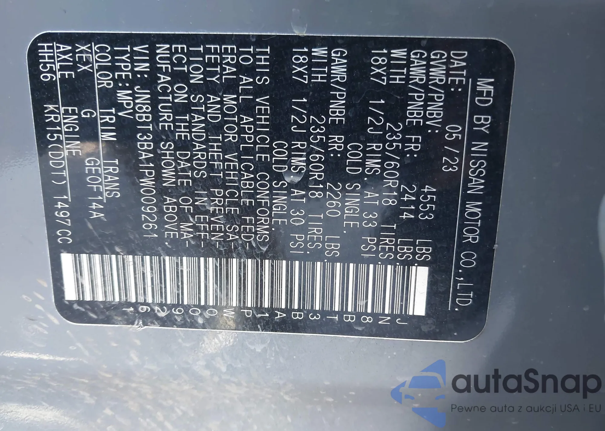 LOT: 43476488 VIN: JN8BT3BA1PW009261
