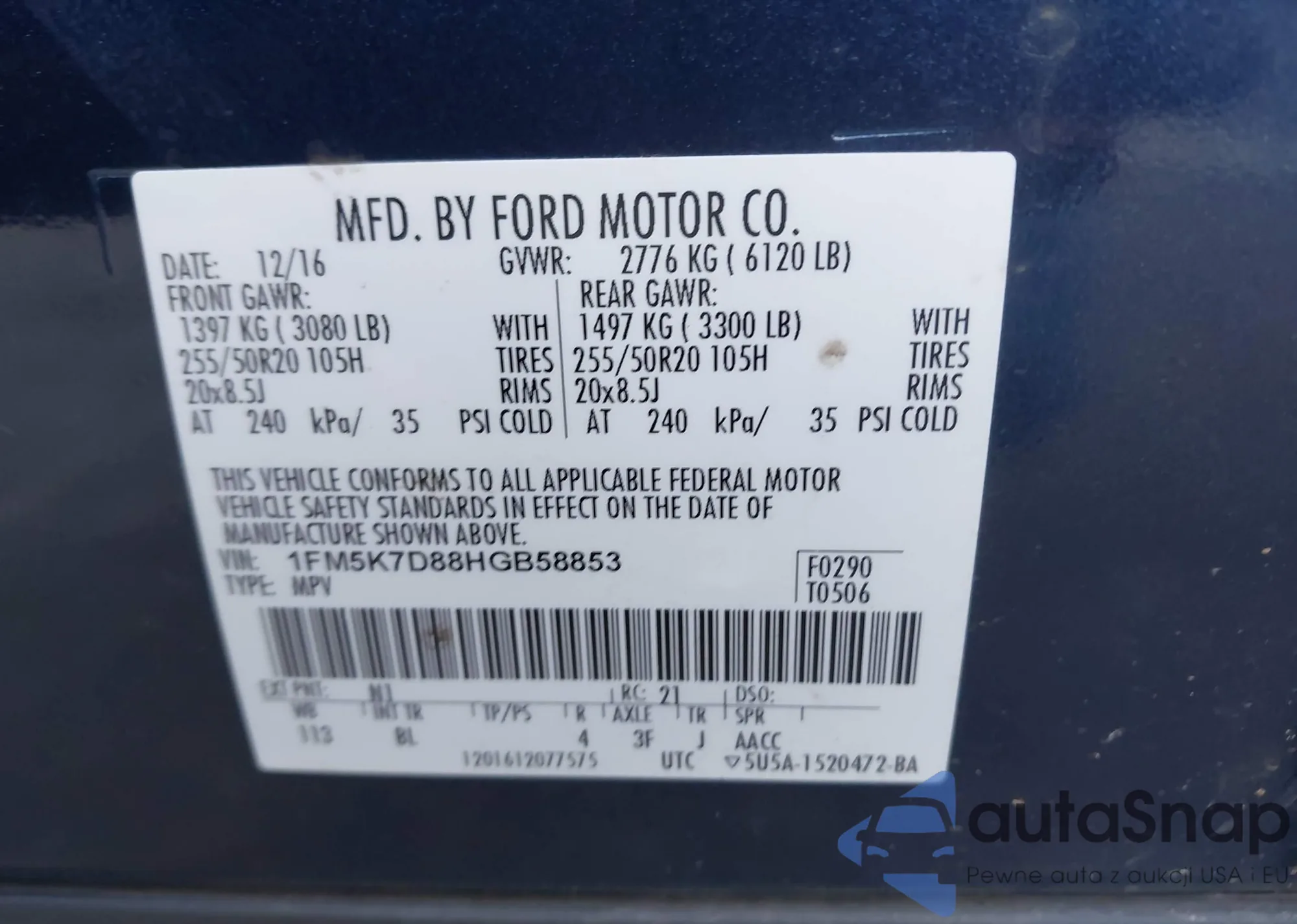 LOT: 43605059 VIN: 1FM5K7D88HGB58853