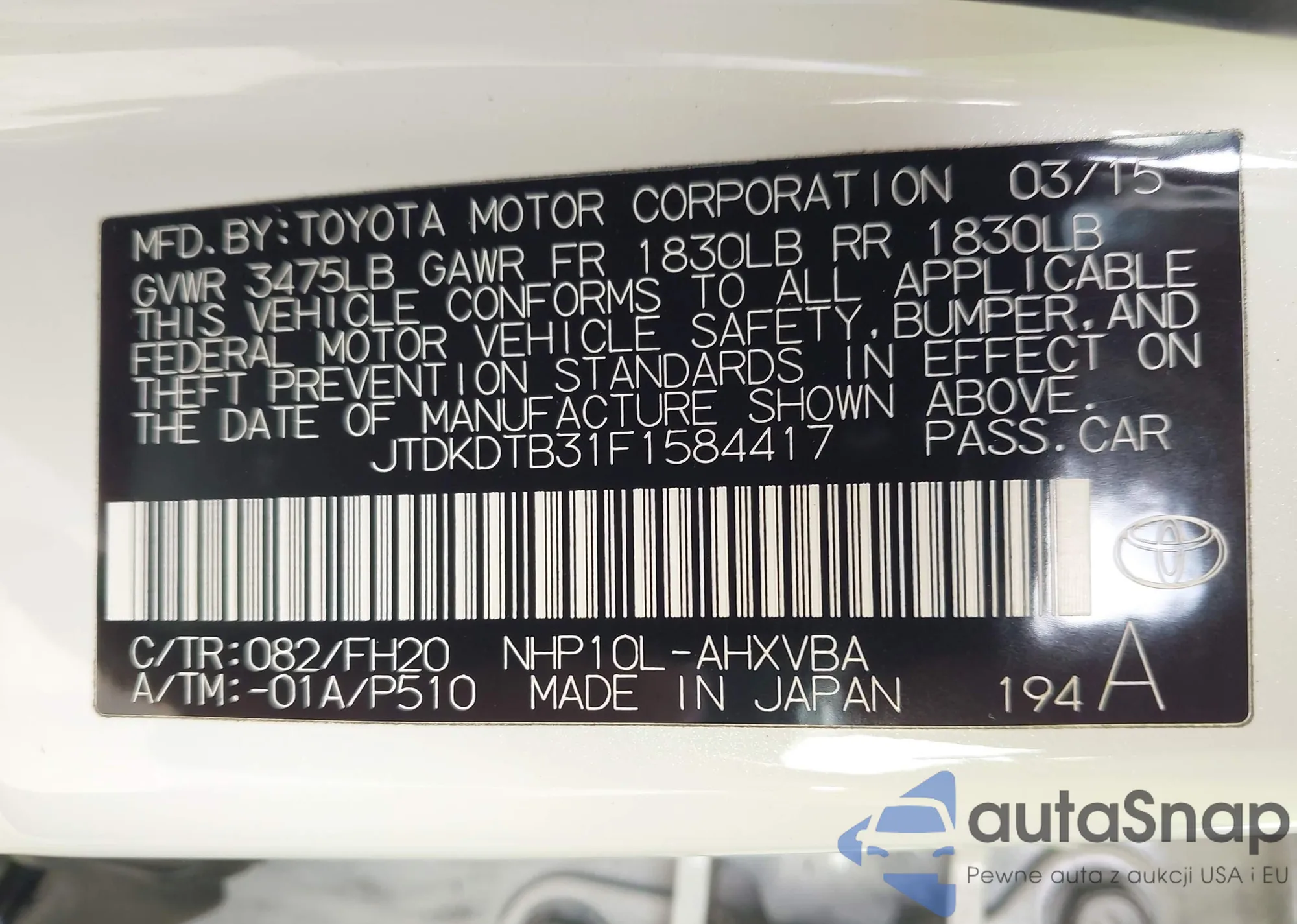 LOT: 43668028 VIN: JTDKDTB31F1584417