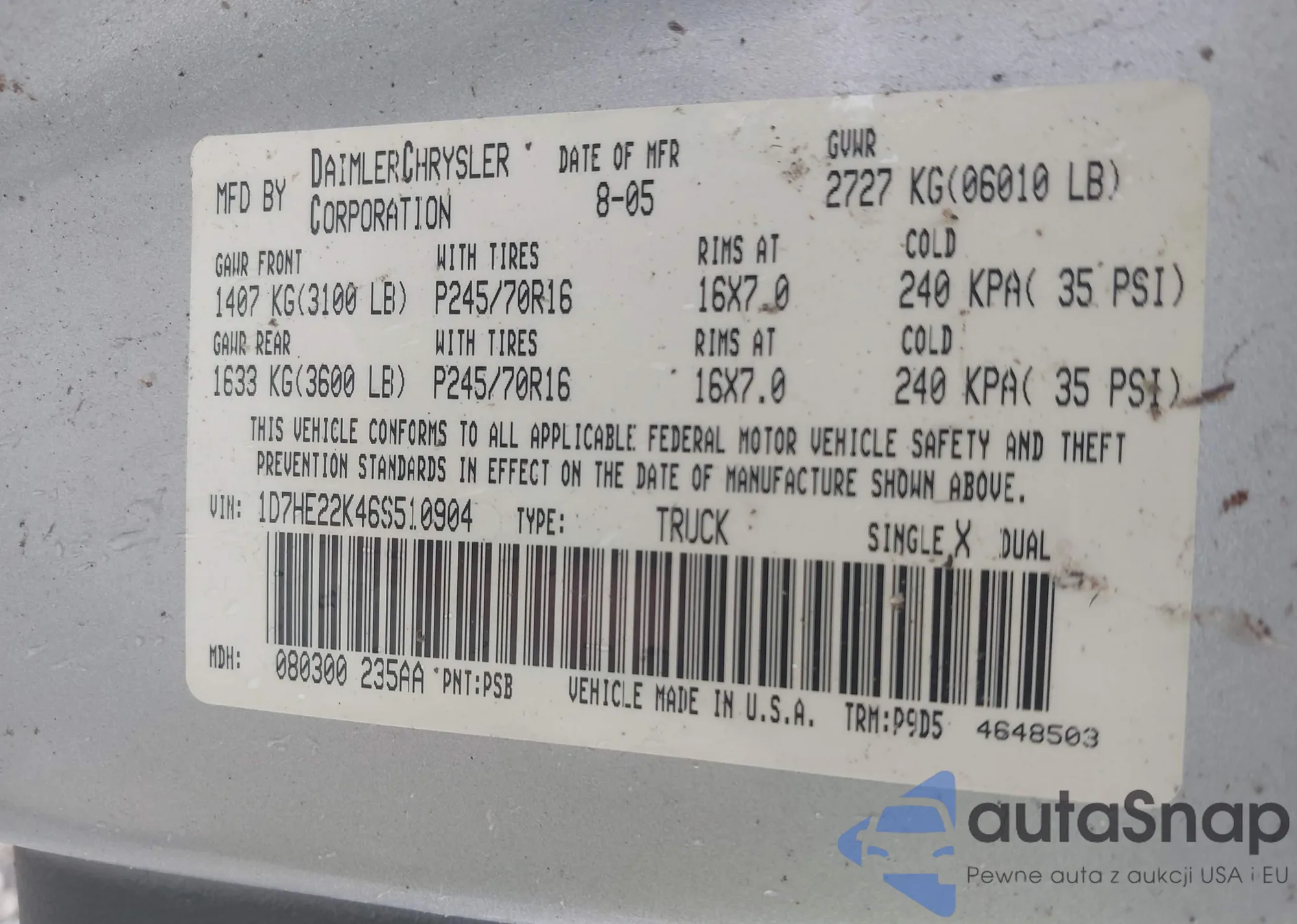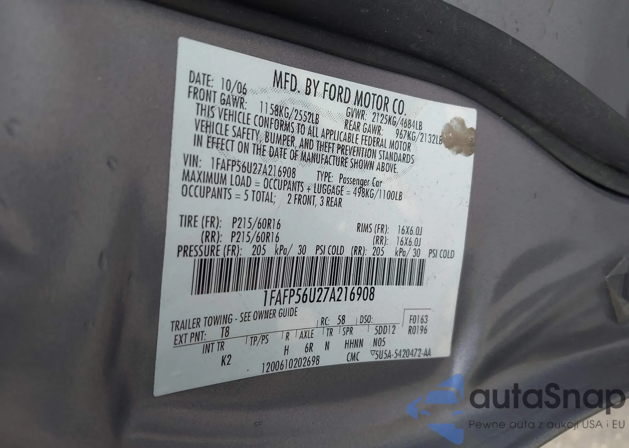 LOT: 43377162 VIN: 1FAFP56U27A216908