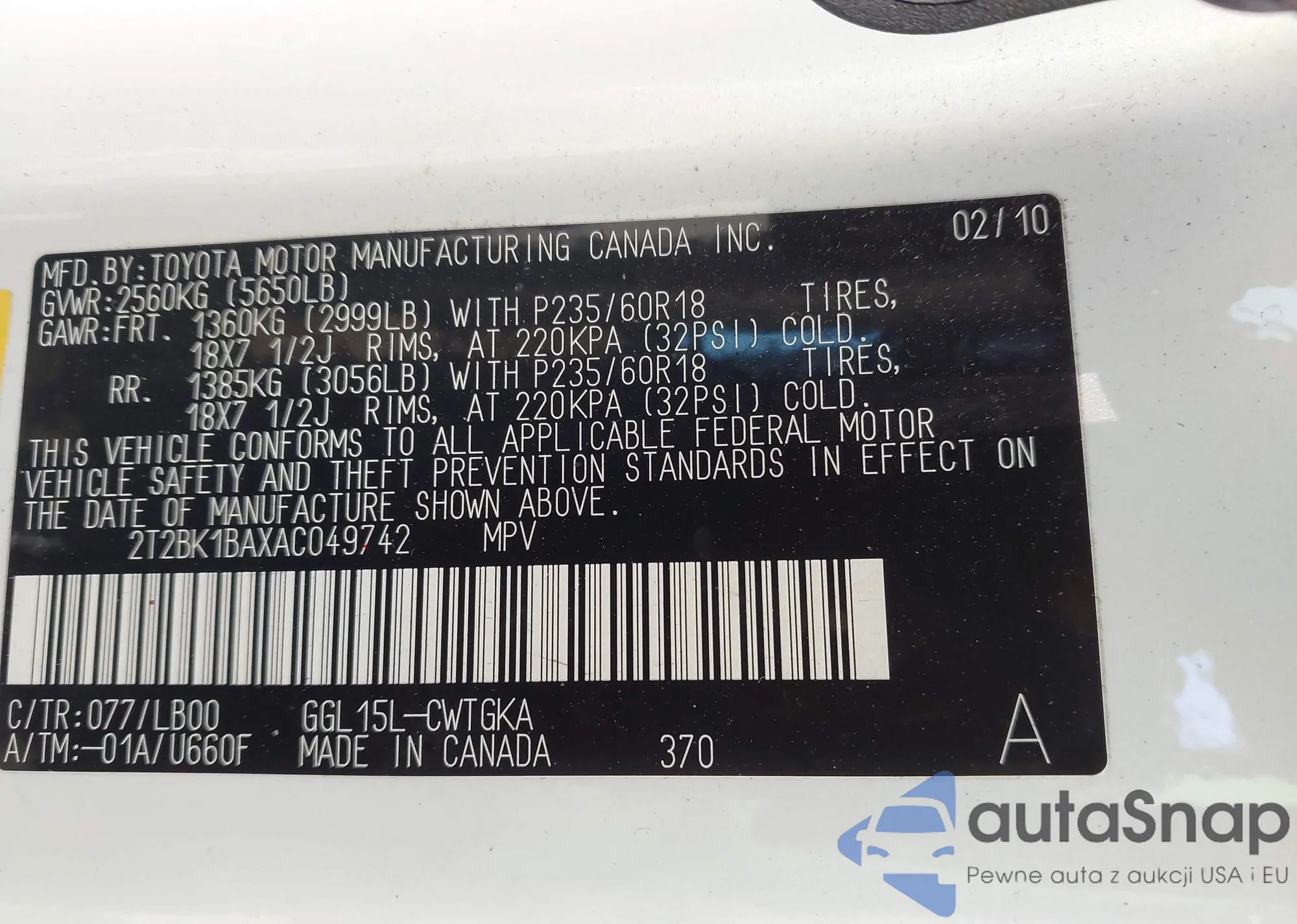 • VIN 2T2BK1BAXAC049742