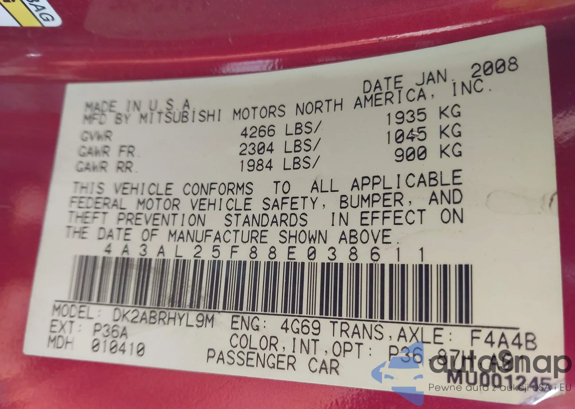 • VIN 4A3AL25F88E038611