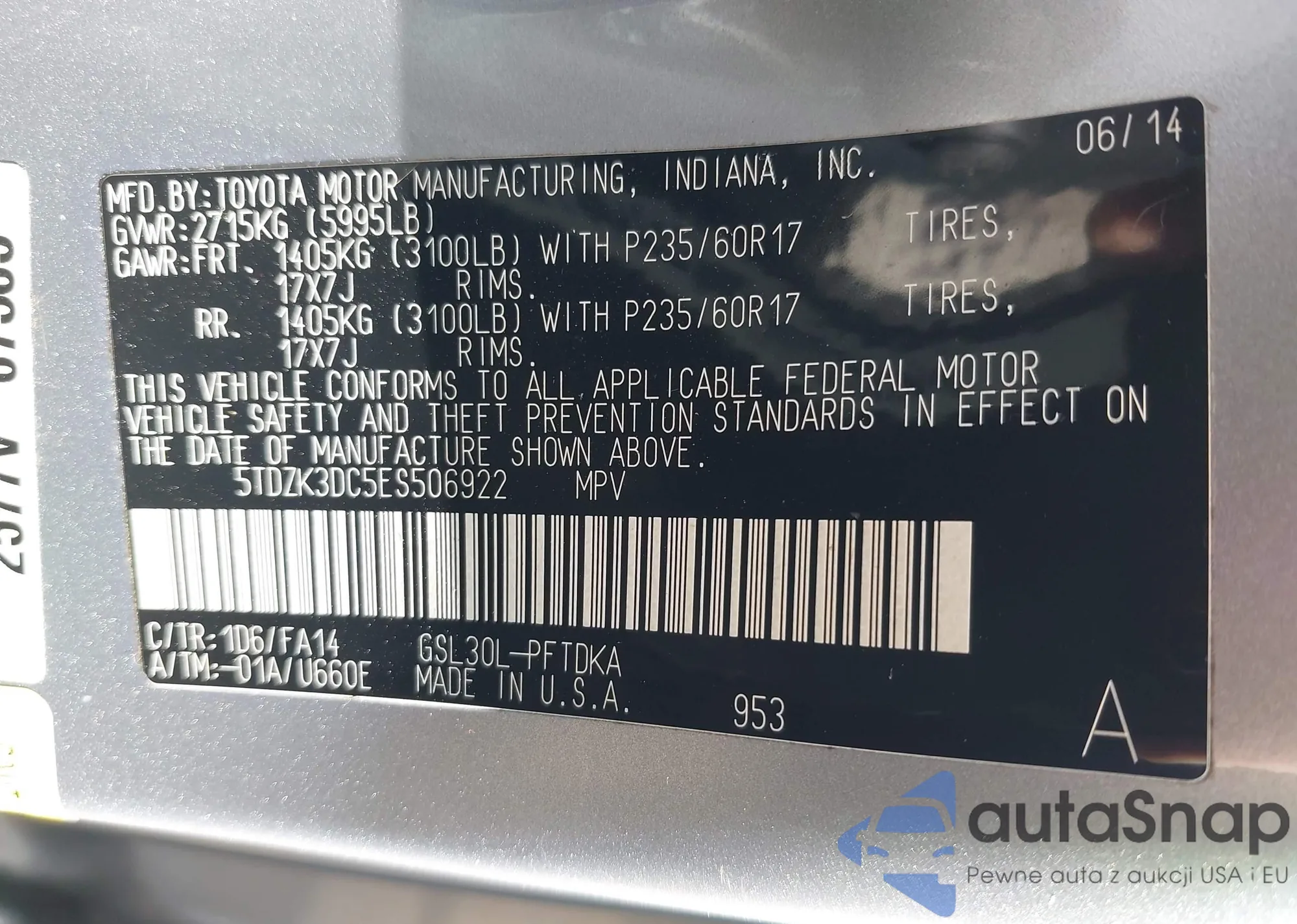 • VIN 5TDZK3DC5ES506922