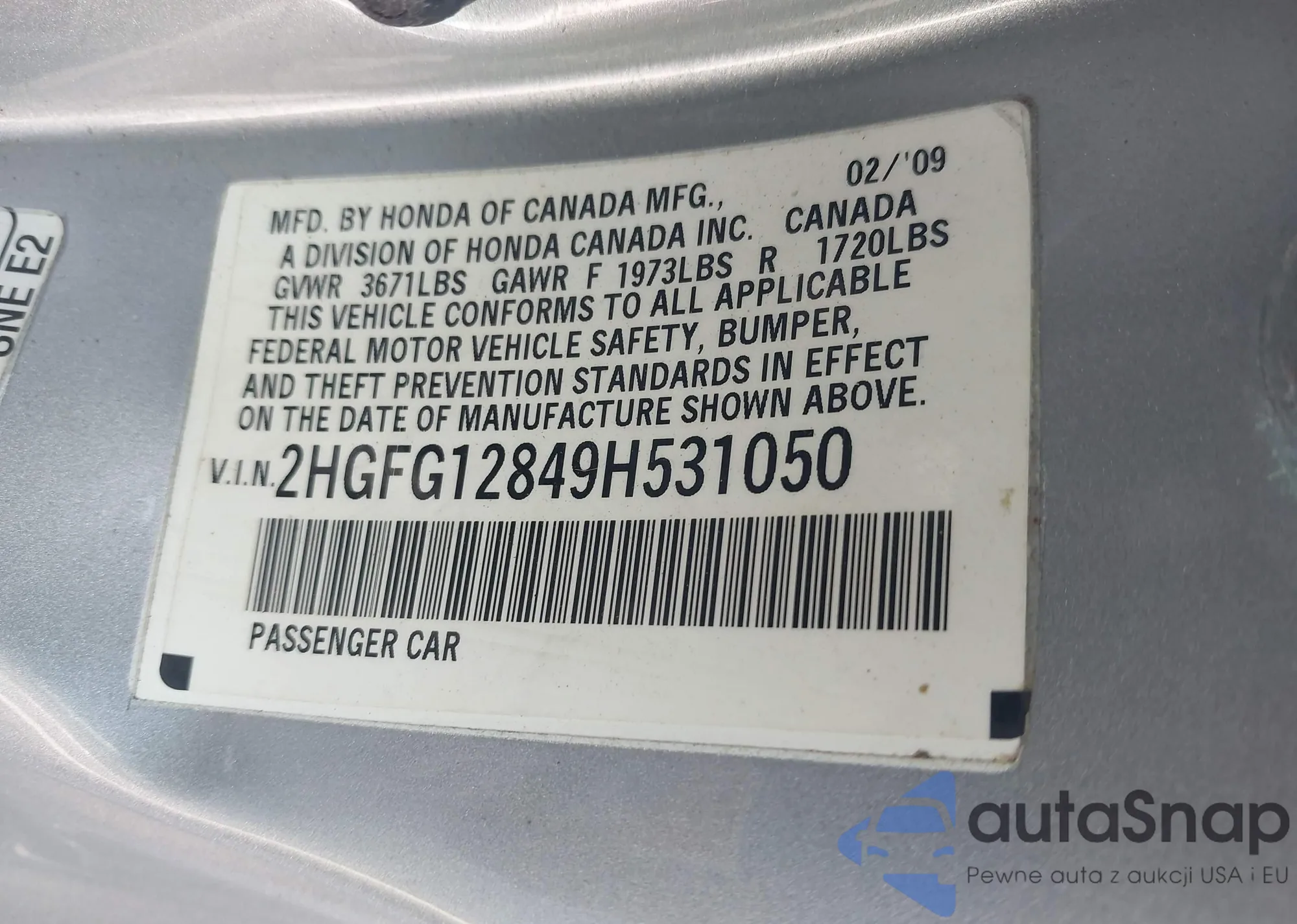 LOT: 43602121 VIN: 2HGFG12849H531050