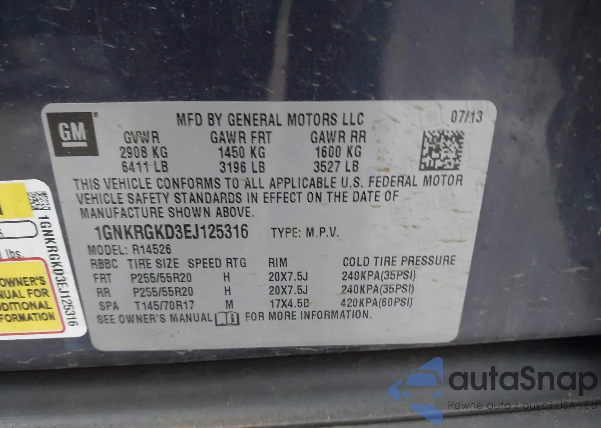 LOT: 43518357 VIN: 1GNKRGKD3EJ125316