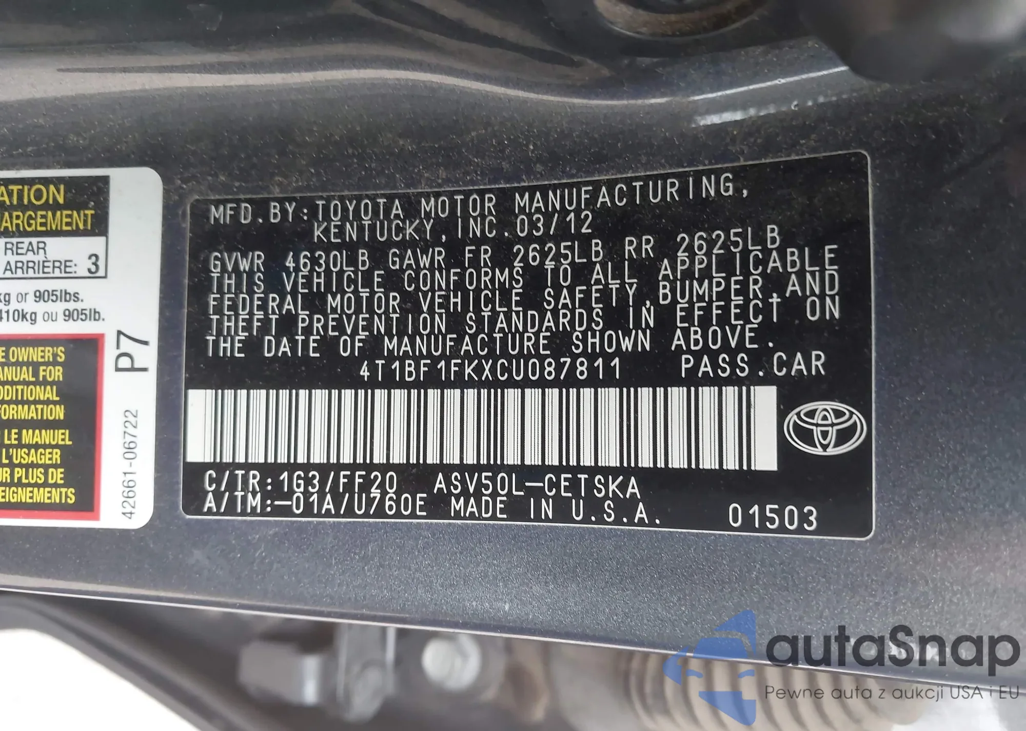 • VIN 4T1BF1FKXCU087811
