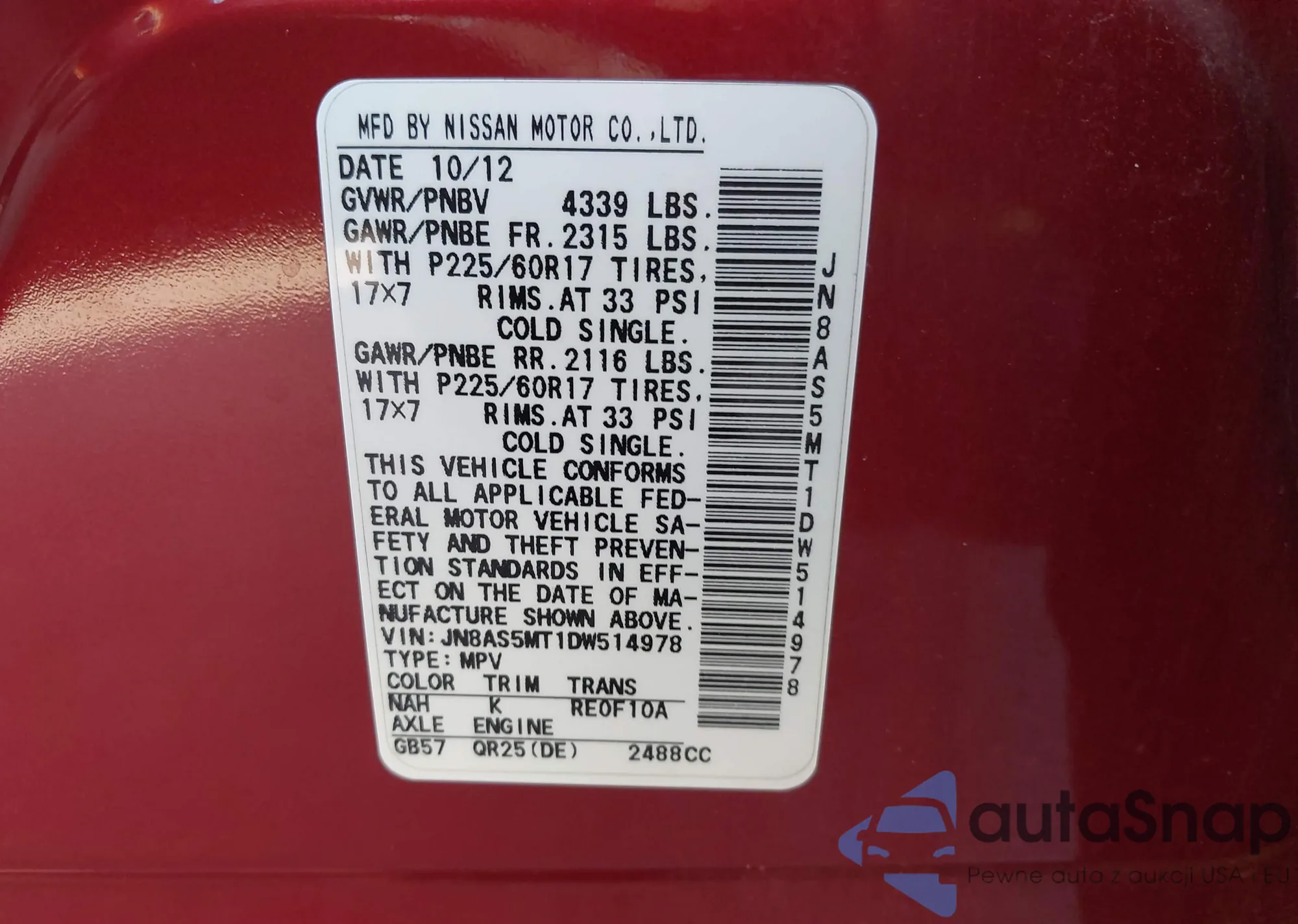 • VIN JN8AS5MT1DW514978