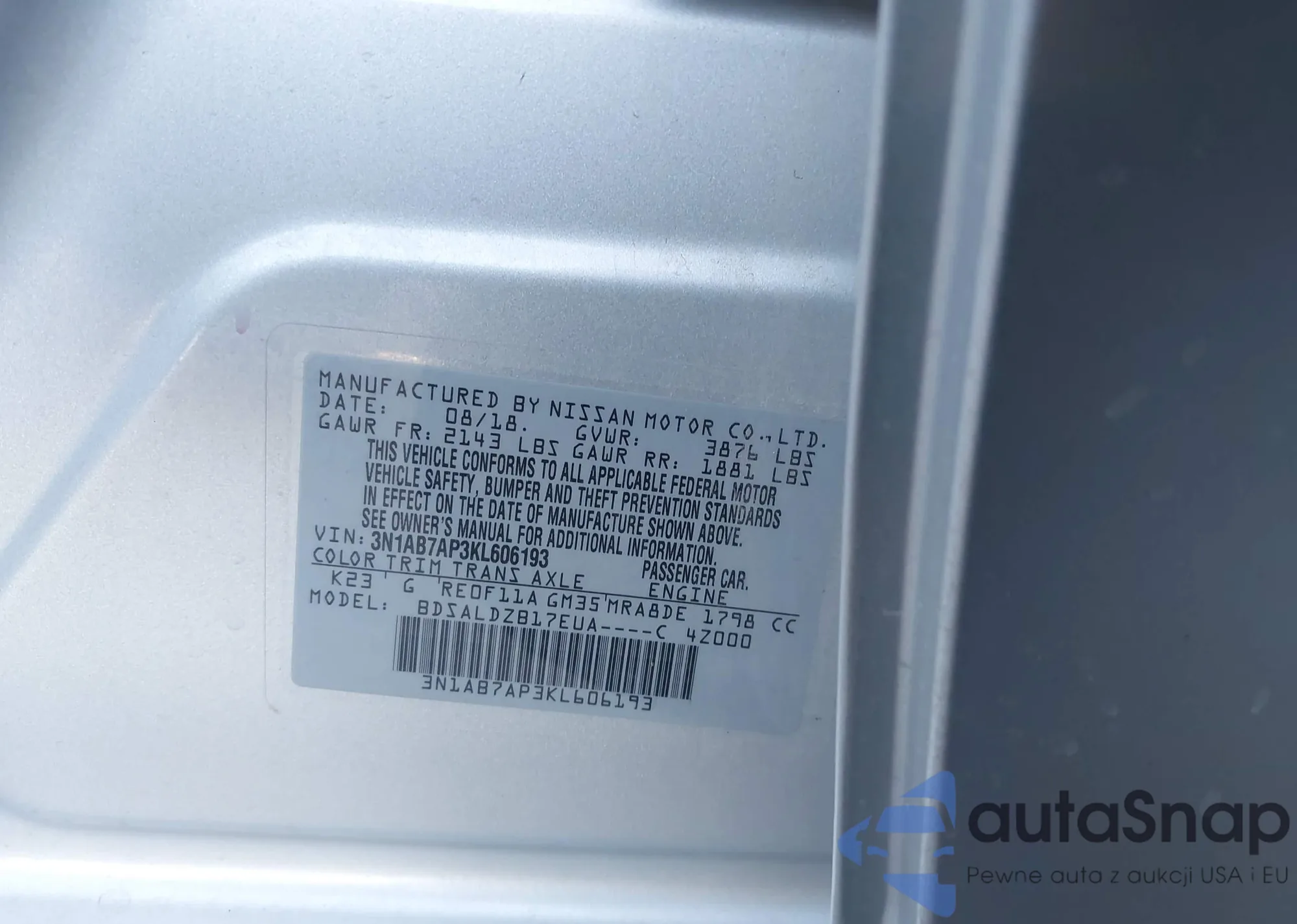 LOT: 43638108 VIN: 3N1AB7AP3KL606193