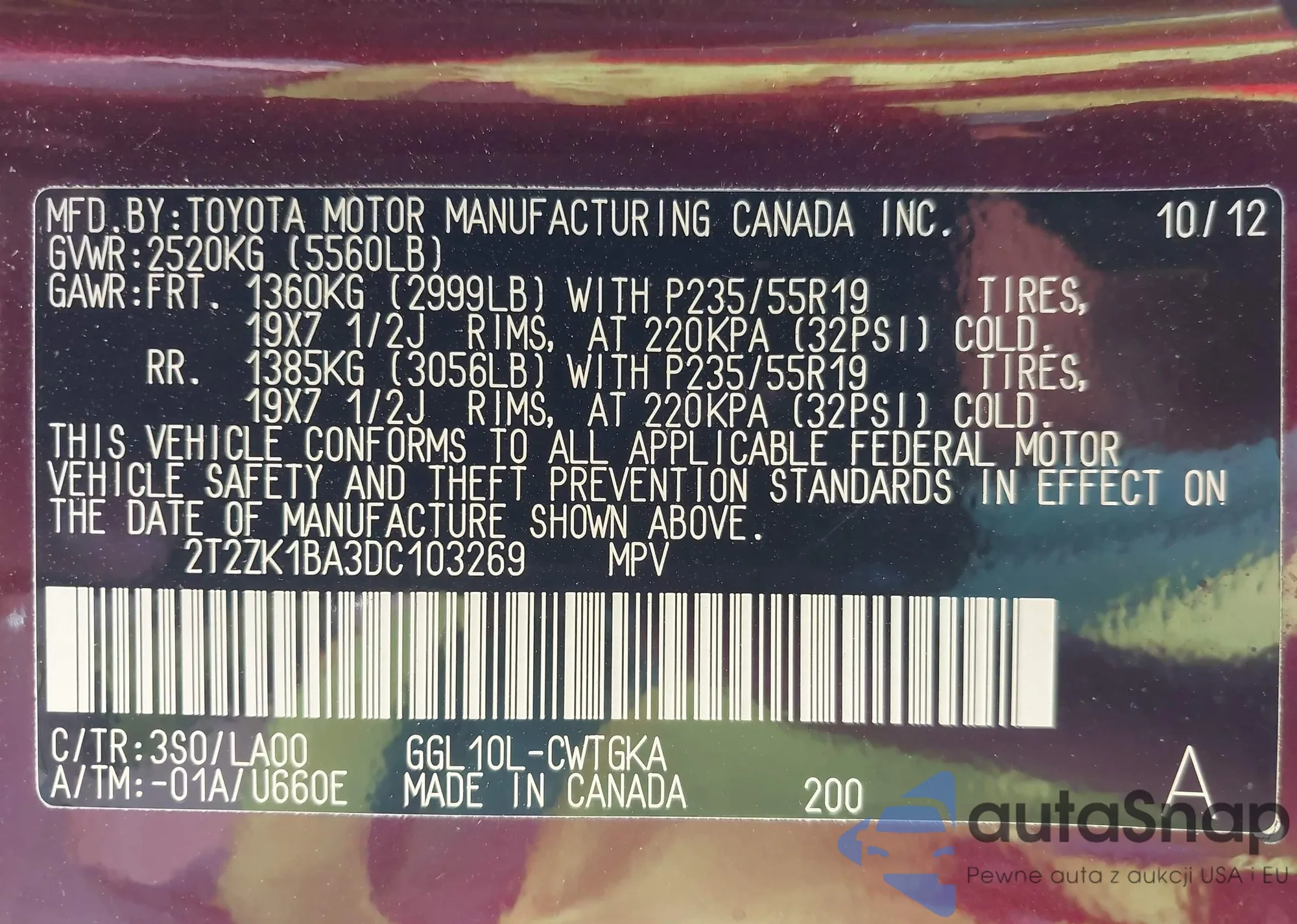 • VIN 2T2ZK1BA3DC103269