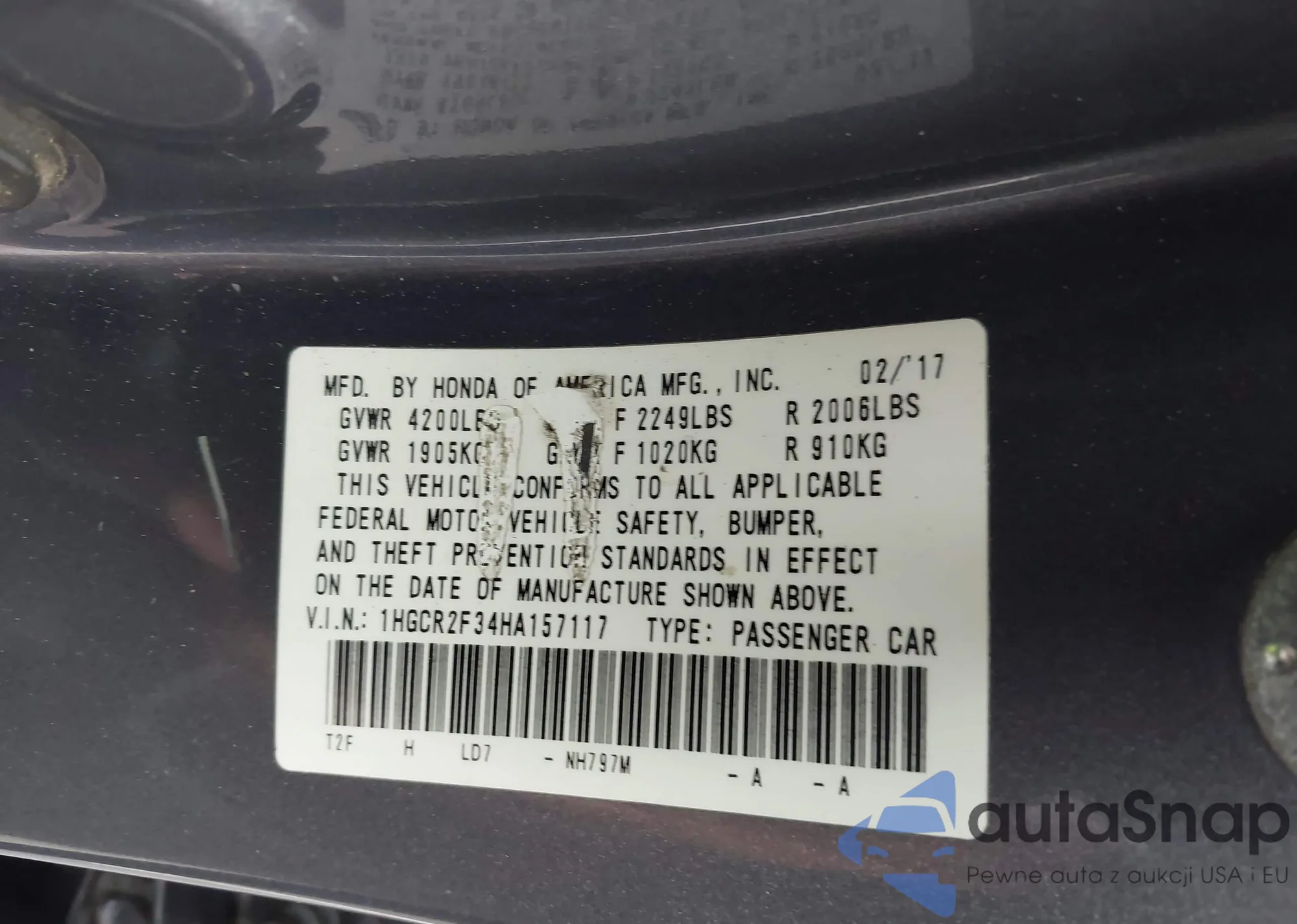 LOT: 43698663 VIN: 1HGCR2F34HA157117