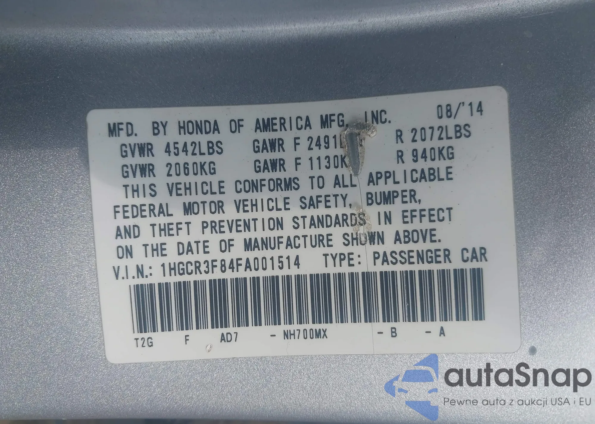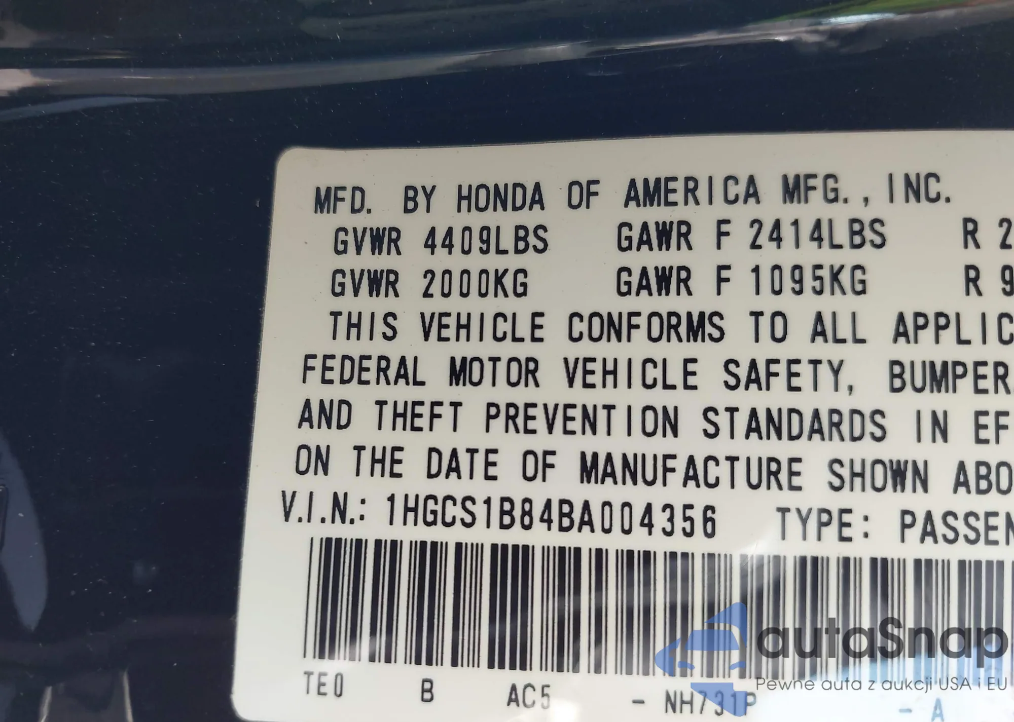LOT: 43804409 VIN: 1HGCS1B84BA004356