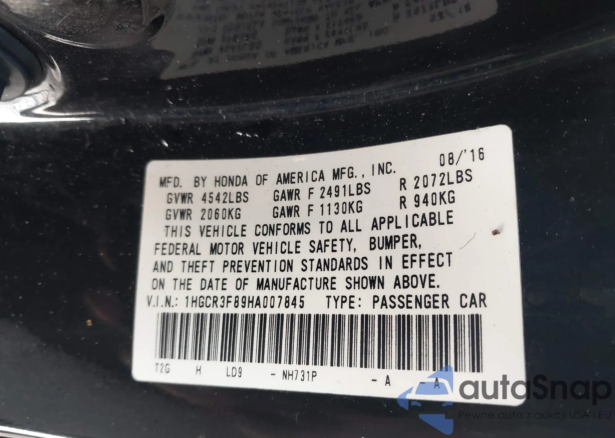 LOT: 43837409 VIN: 1HGCR3F89HA007845