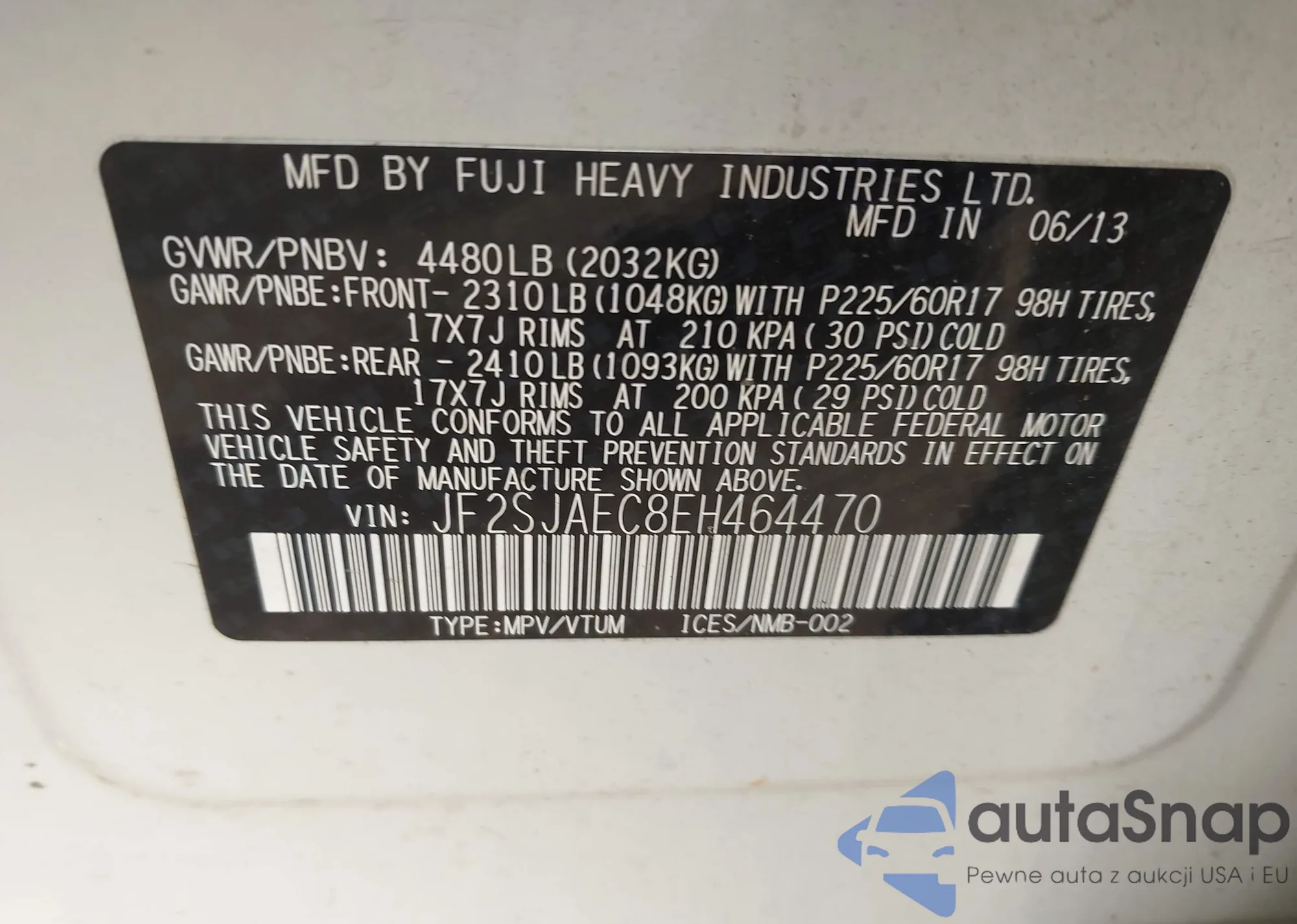 • VIN JF2SJAEC8EH464470