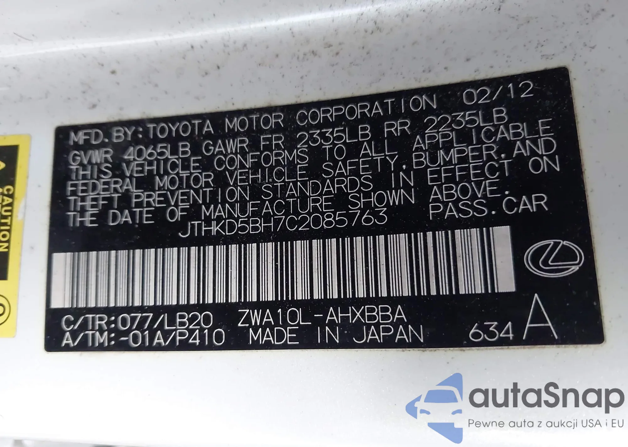 LOT: 43574198 VIN: JTHKD5BH7C2085763
