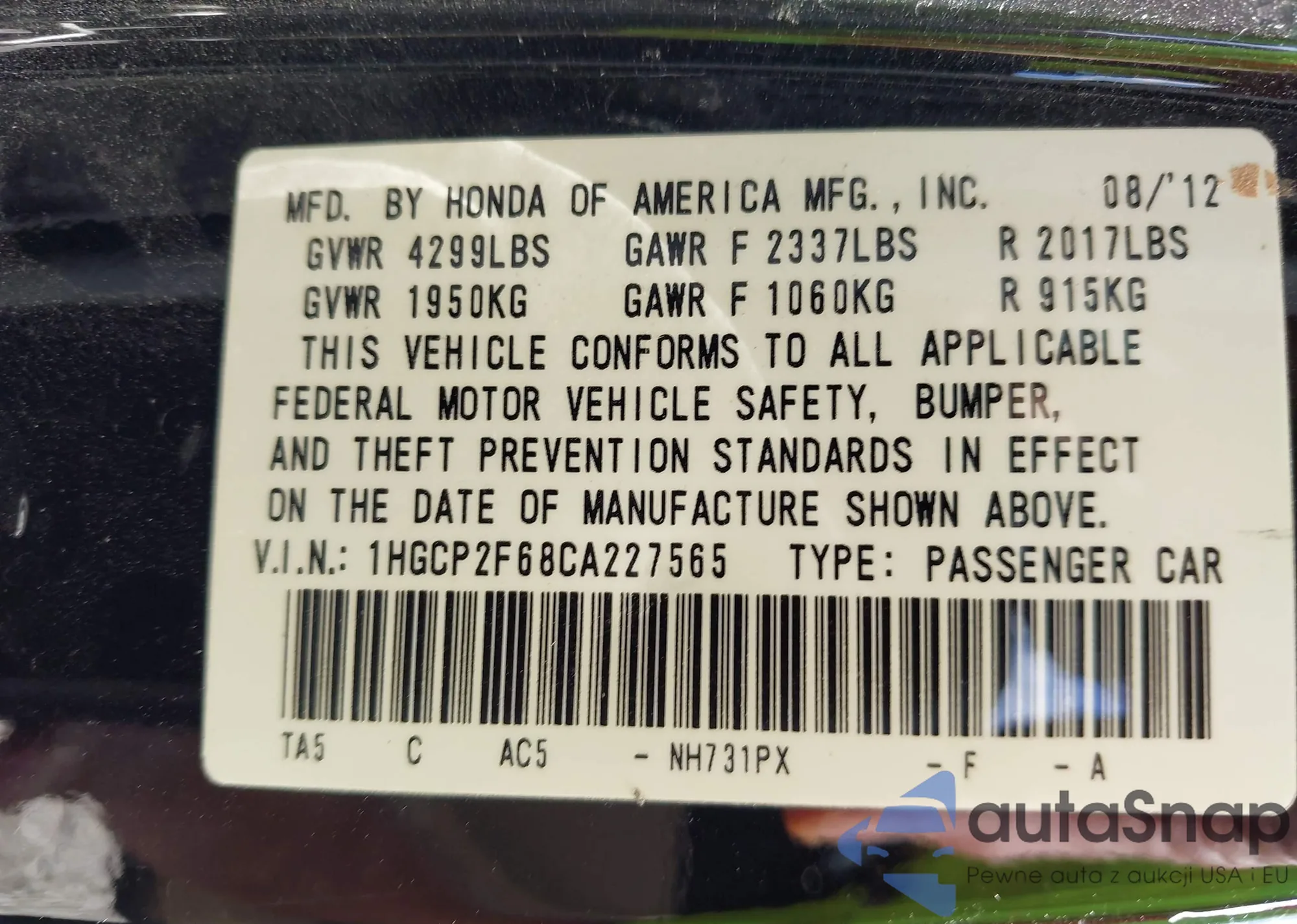 LOT: 43381817 VIN: 1HGCP2F68CA227565