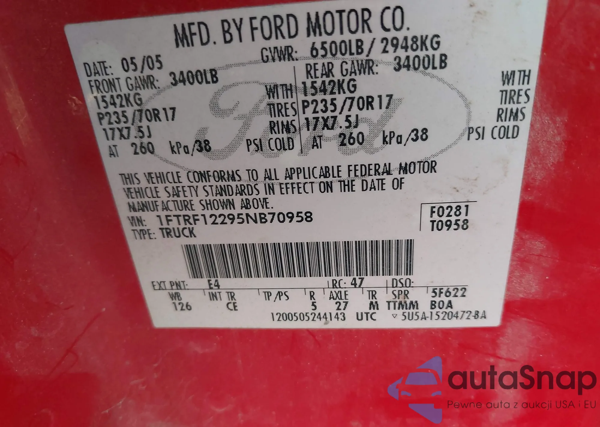 LOT: 43705871 VIN: 1FTRF12295NB70958