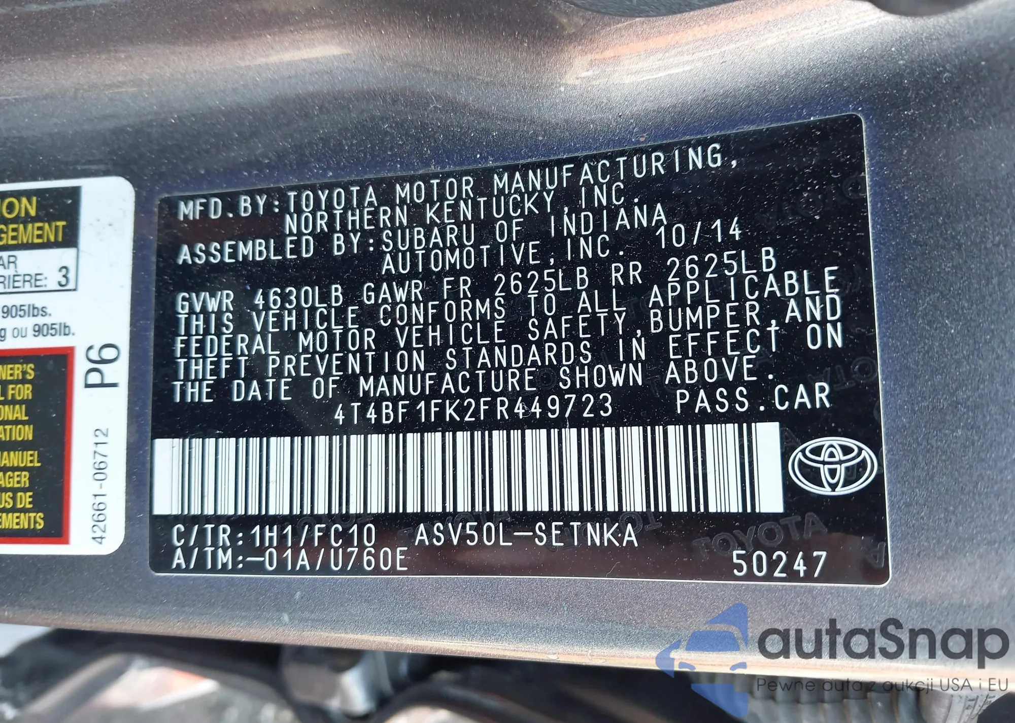 • VIN 4T4BF1FK2FR449723
