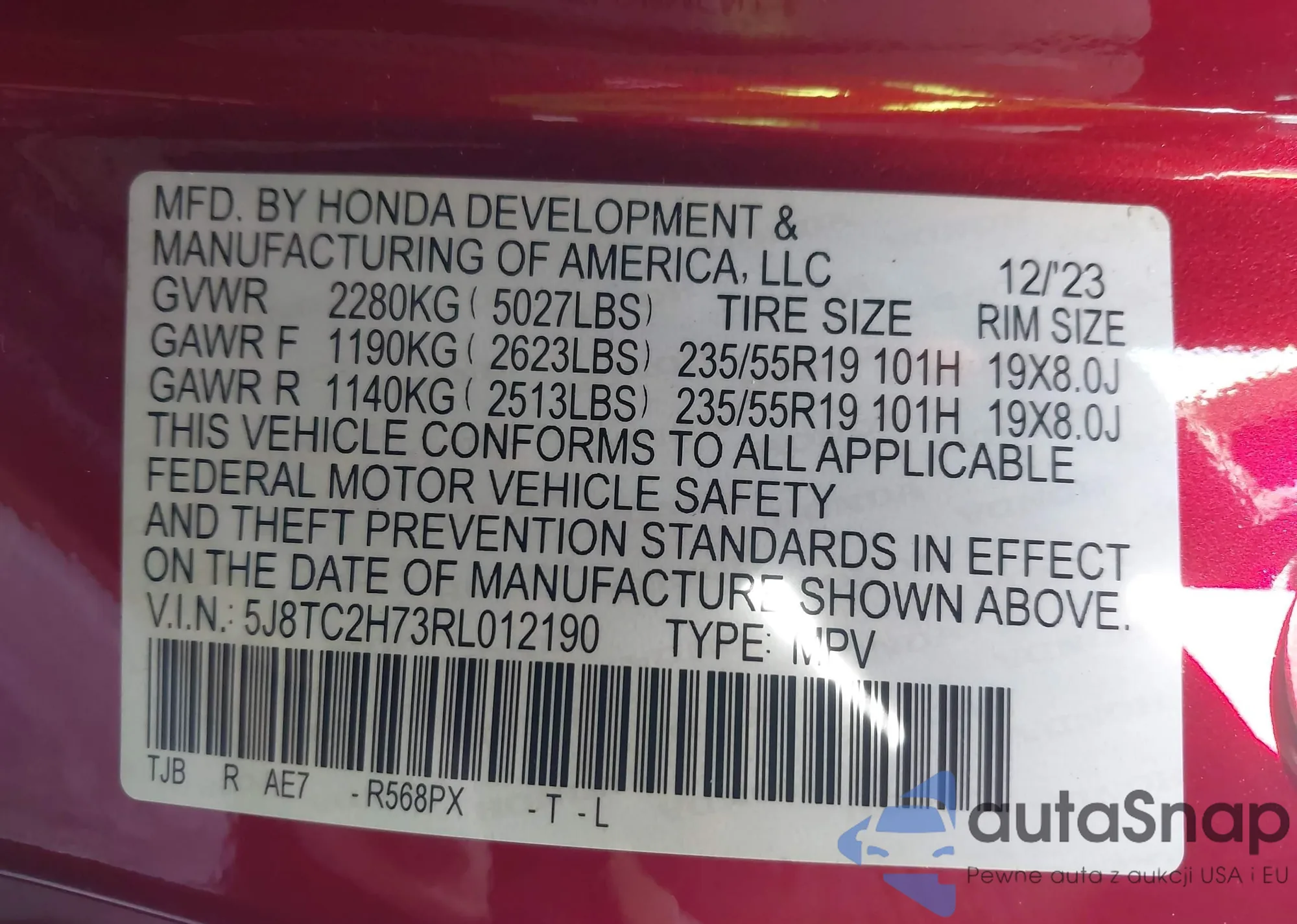 • VIN 5J8TC2H73RL012190