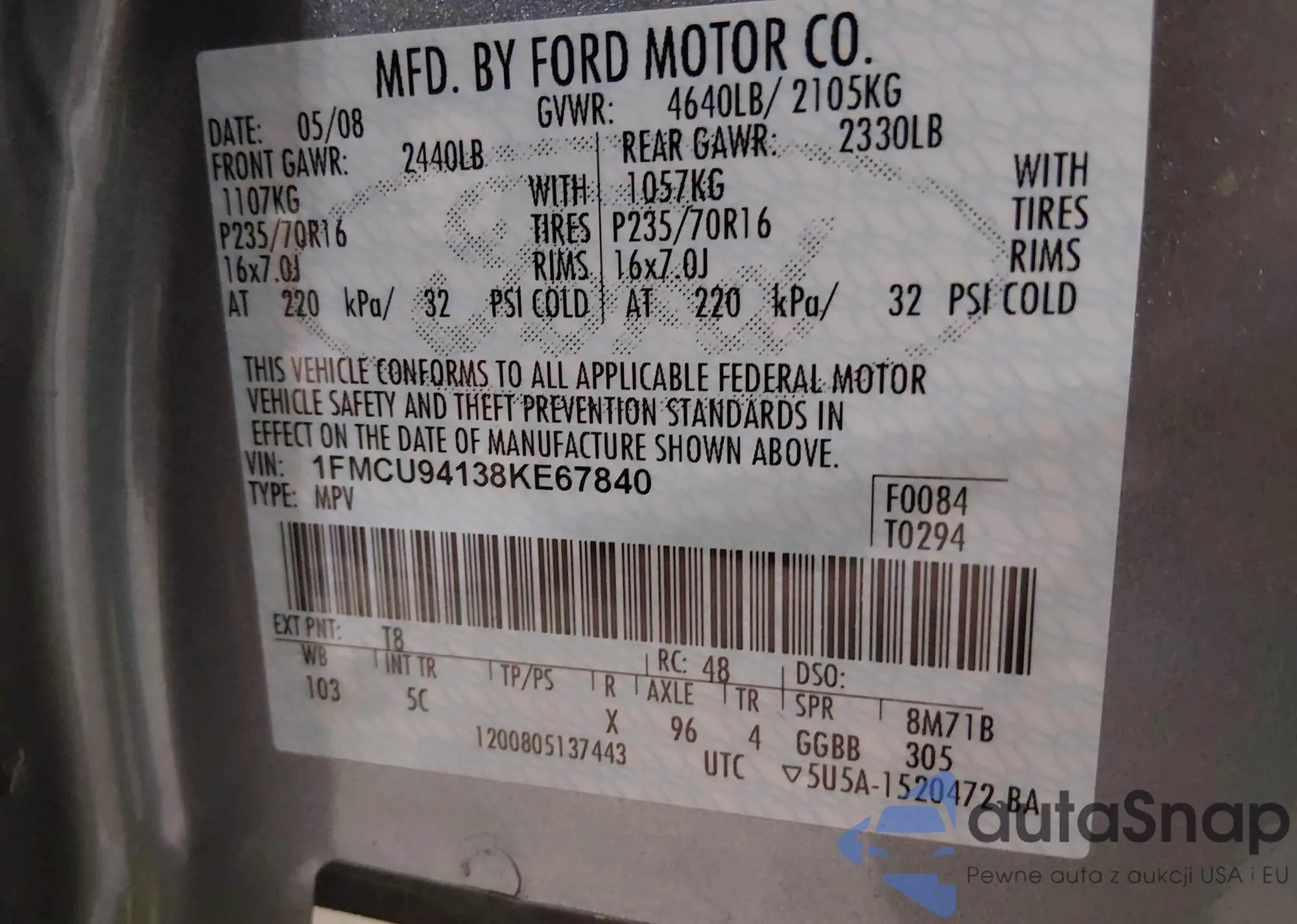 • VIN 1FMCU94138KE67840