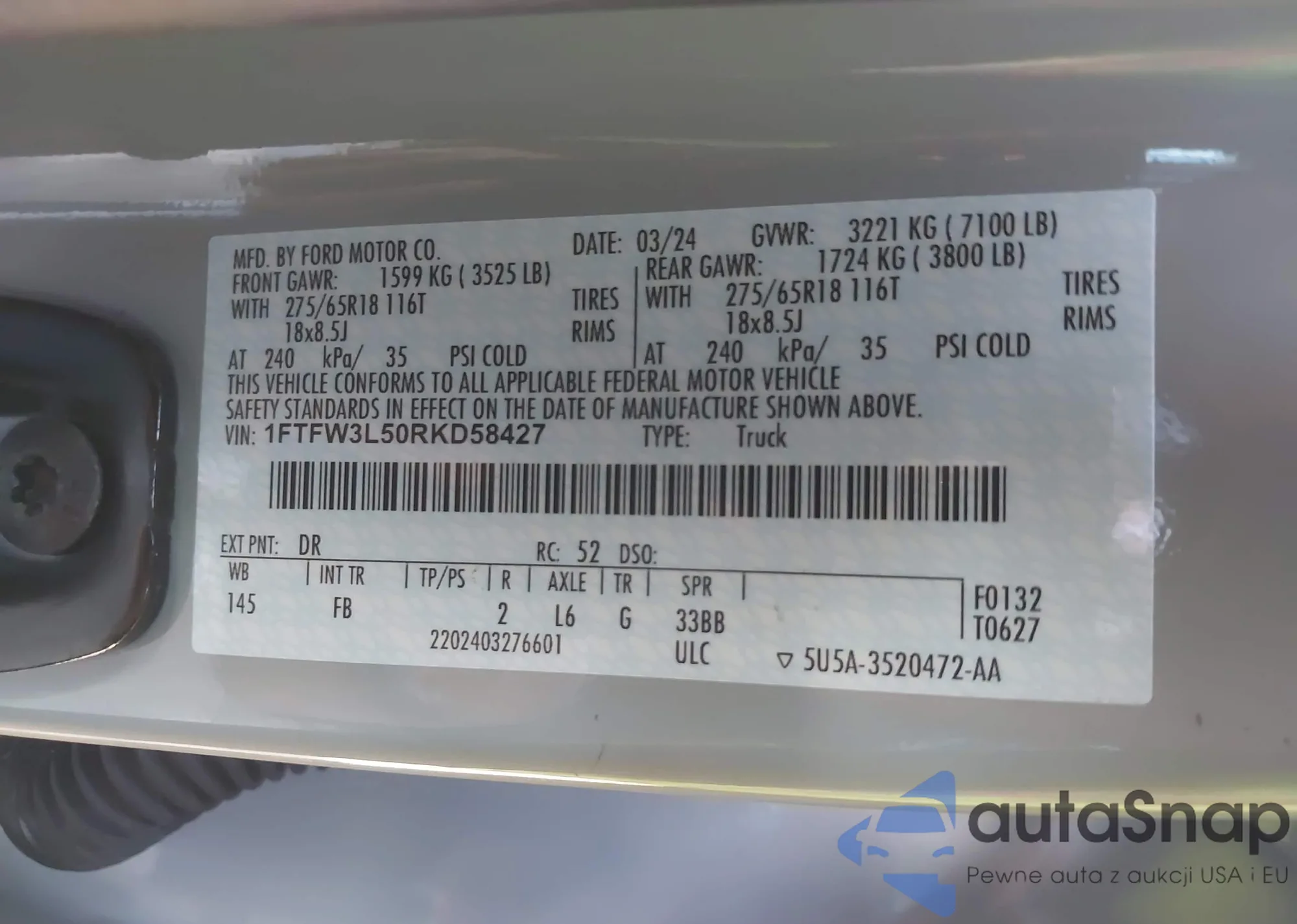 LOT: 43633461 VIN: 1FTFW1CF0DKG06584
