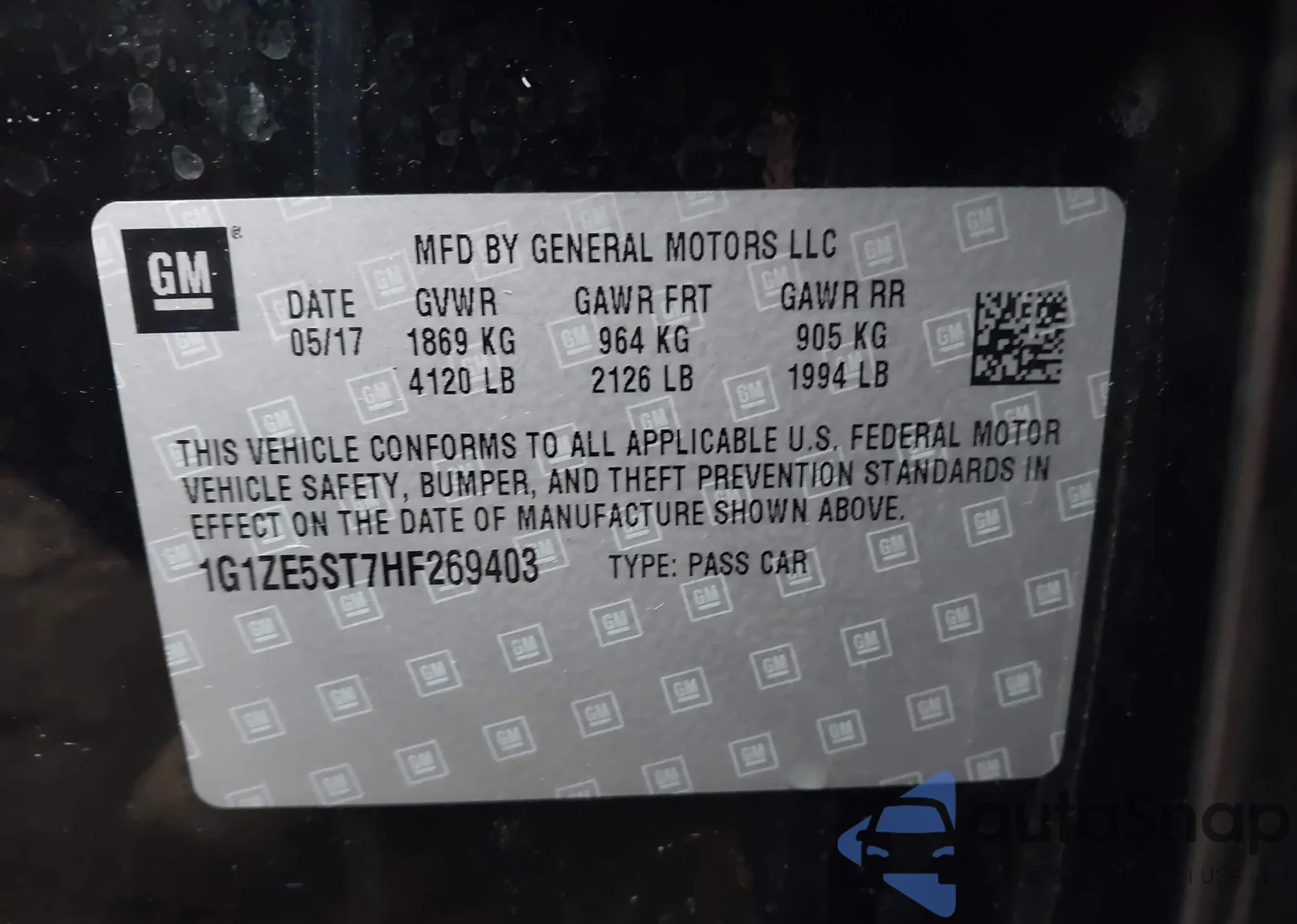 • VIN 1G1ZE5ST7HF269403