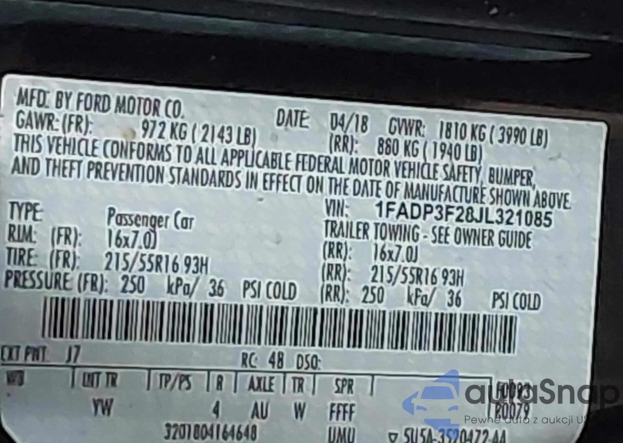 LOT: 43750111 VIN: 1FADP3F28JL321085
