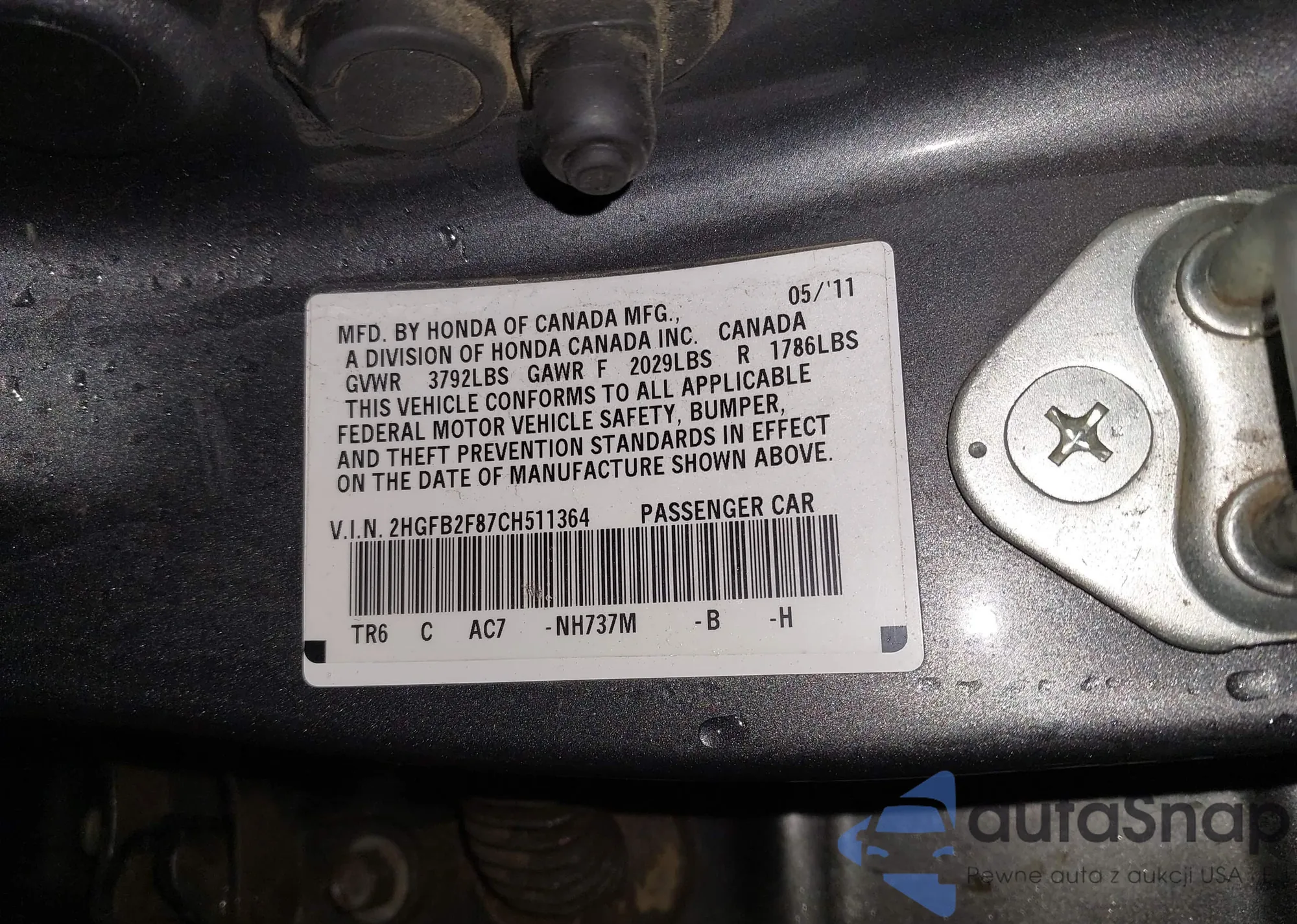 LOT: 43768165 VIN: 2HGFB2F87CH511364