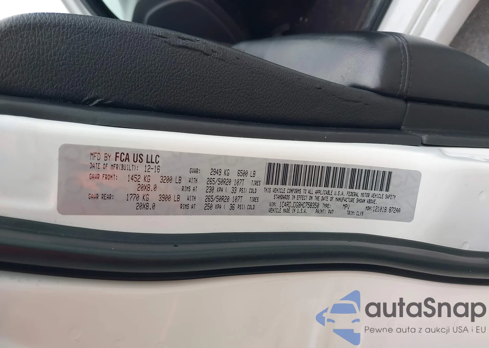 LOT: 43750785 VIN: 1C4RDJDG8HC758350