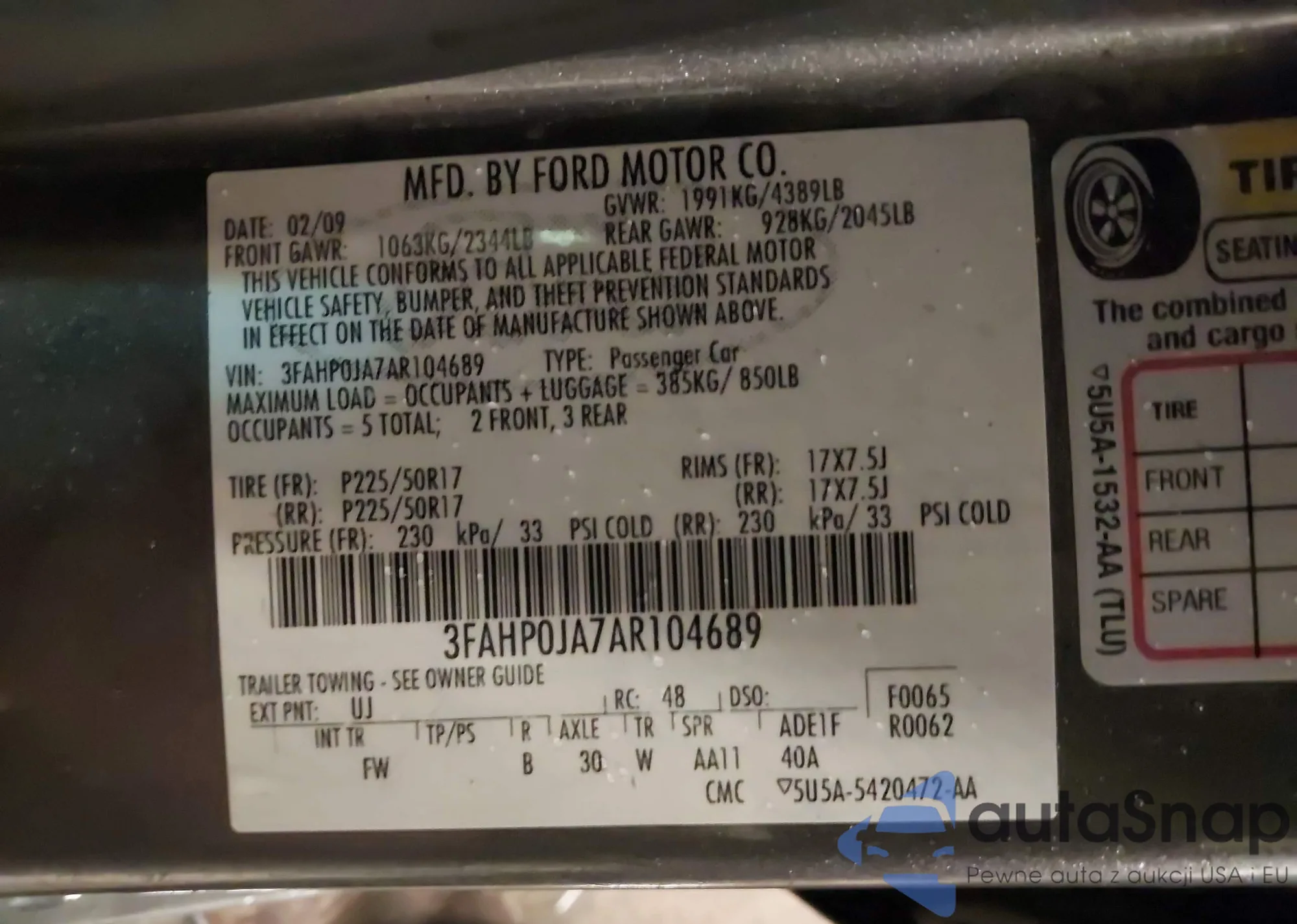 • VIN 3FAHP0JA7AR104689