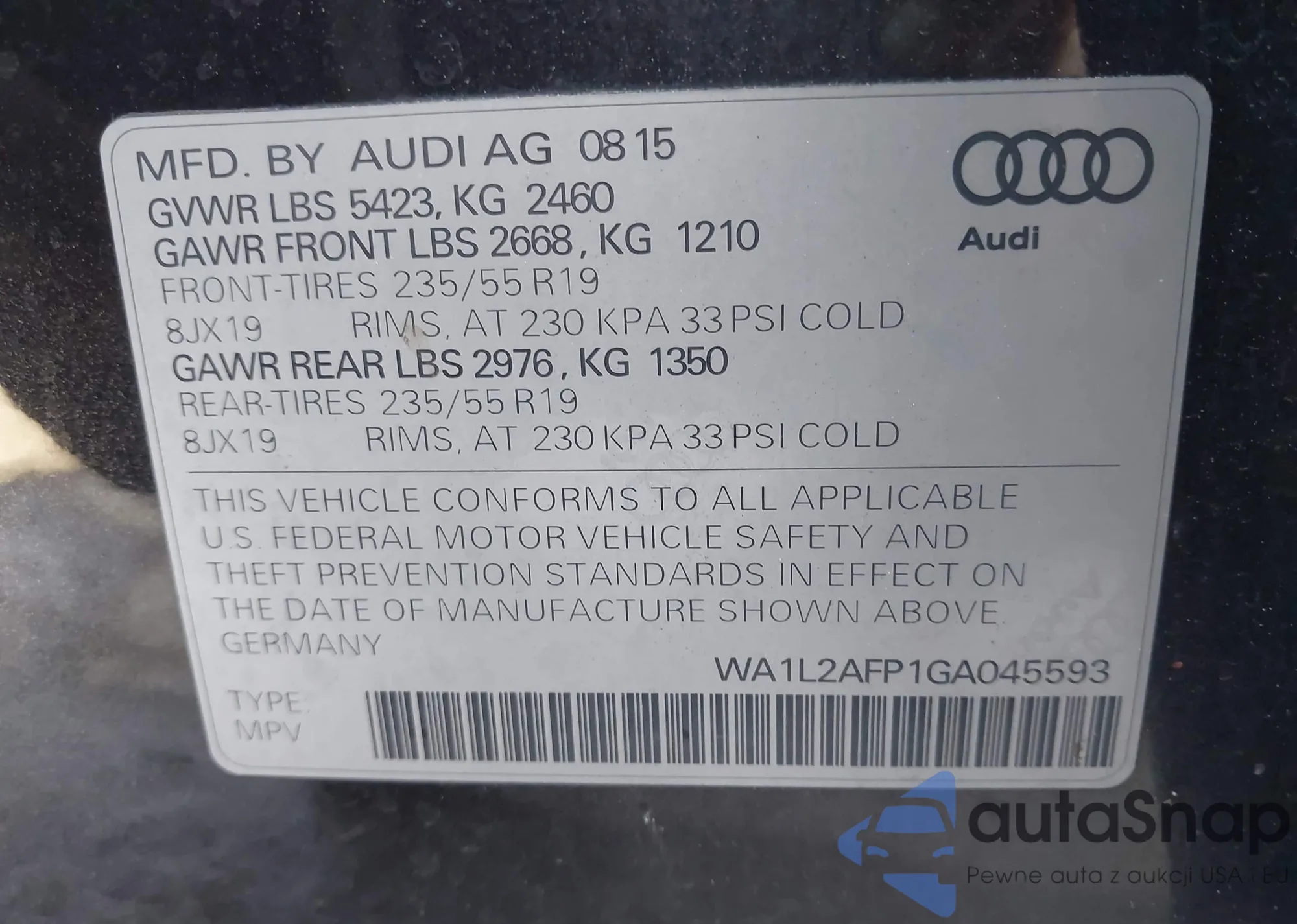 LOT: 43908412 VIN: WA1L2AFP1GA045593