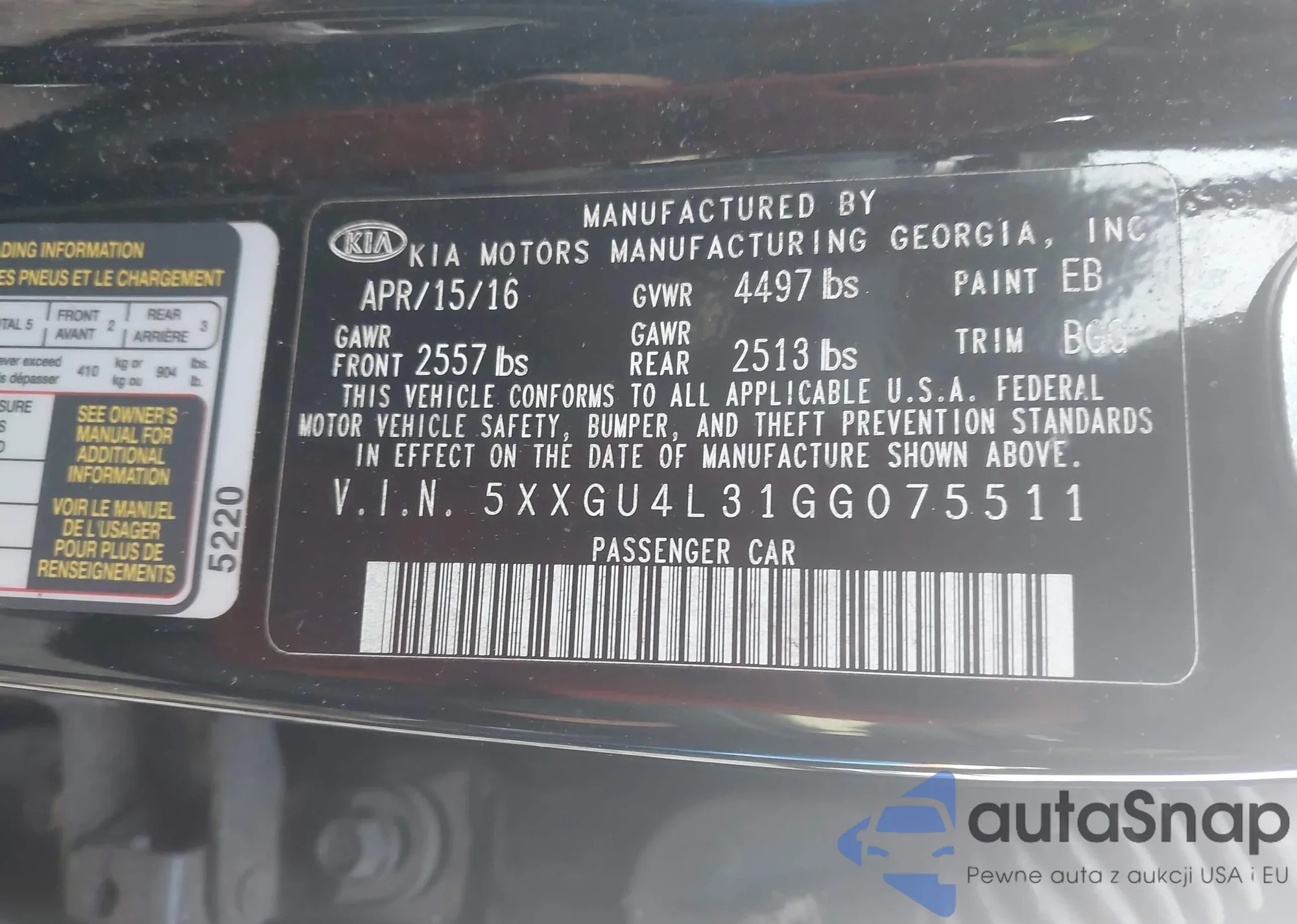 LOT: 43933083 VIN: 5XXGU4L31GG075511