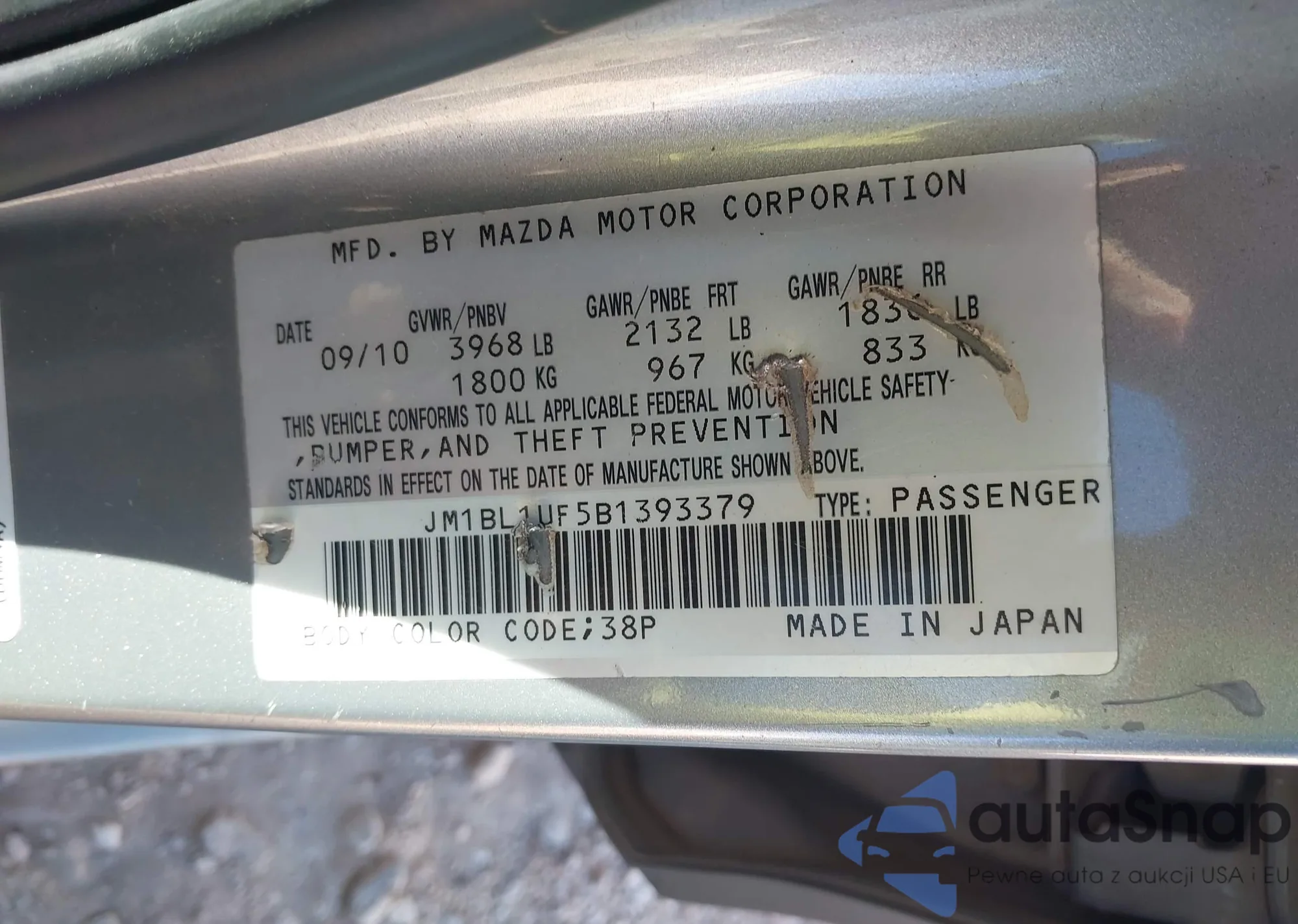 LOT: 43900321 VIN: JM1BL1UF5B1393379
