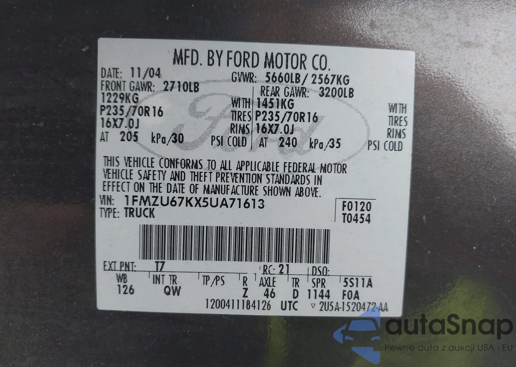 • VIN 1FMZU67KX5UA71613