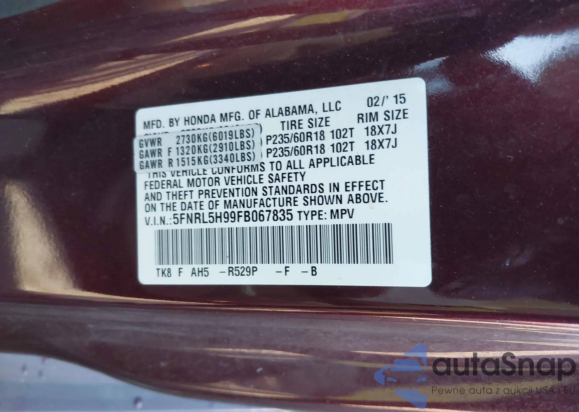 LOT: 42825169 VIN: 5FNRL5H99FB067835