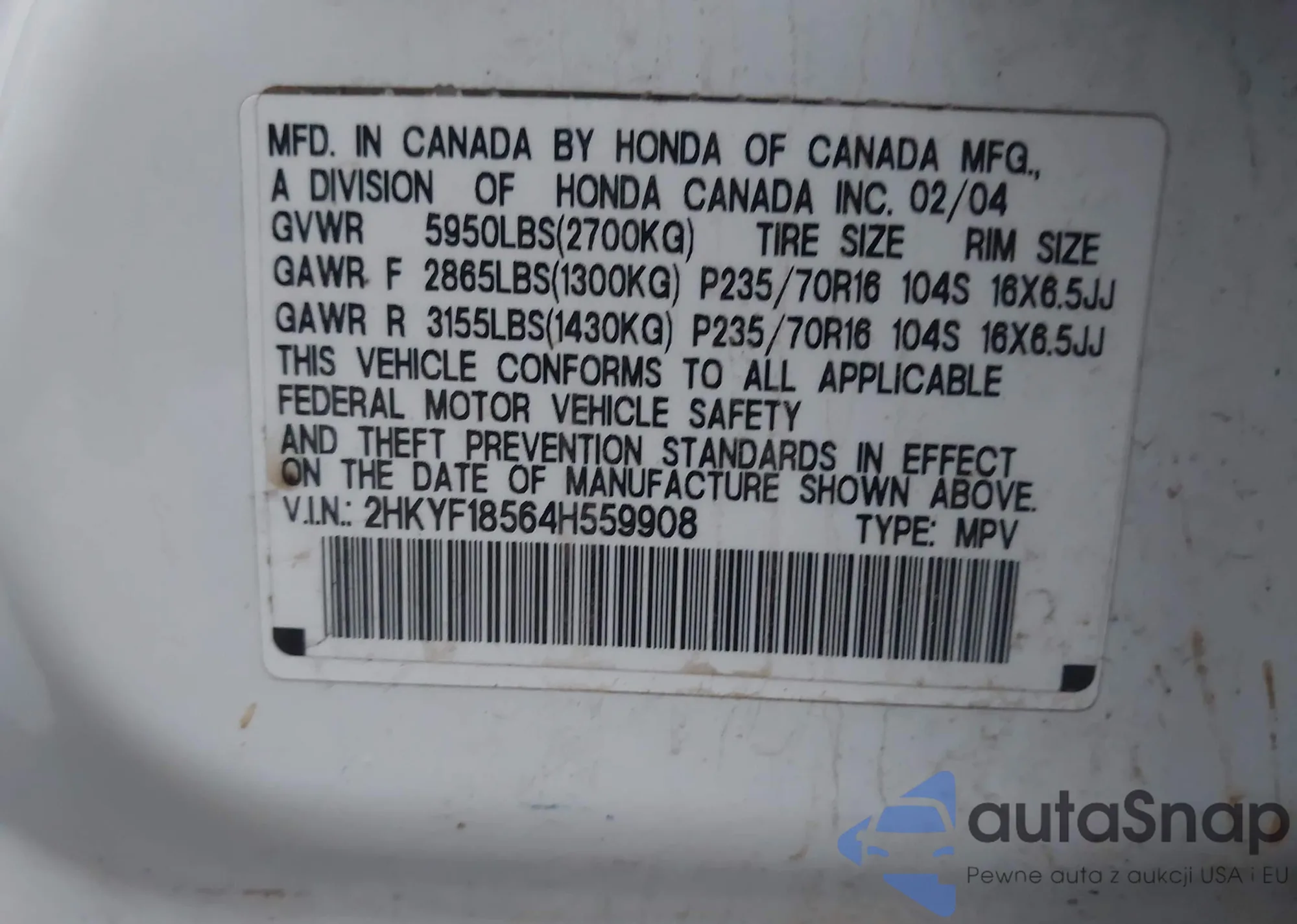 LOT: 43742485 VIN: 2HKYF18564H559908