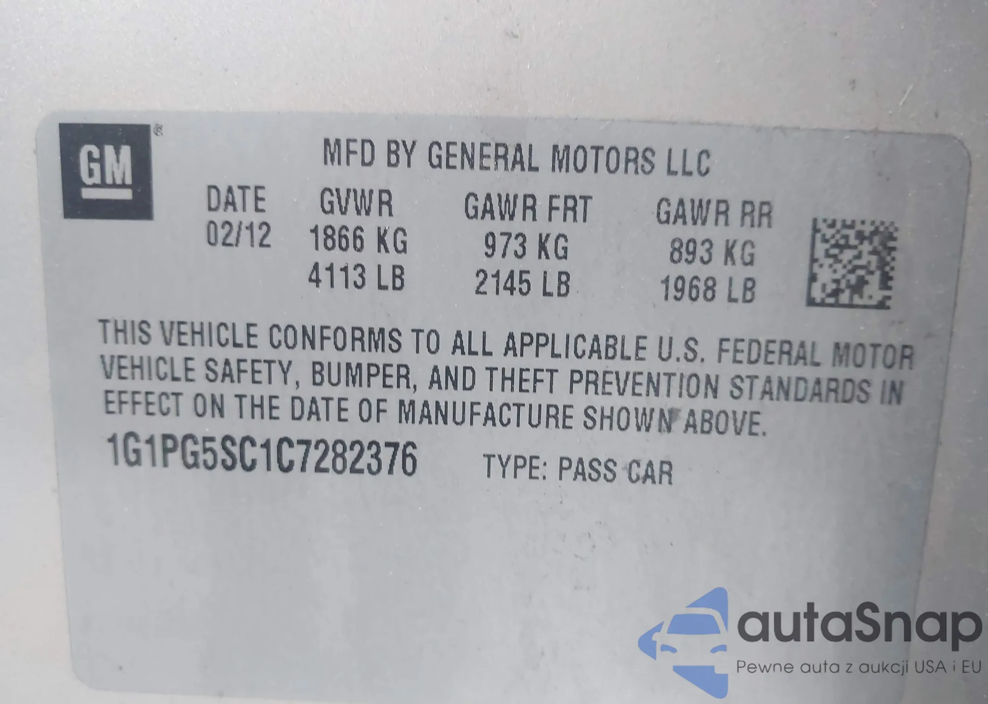 LOT: 43322731 VIN: 1G1PG5SC1C7282376