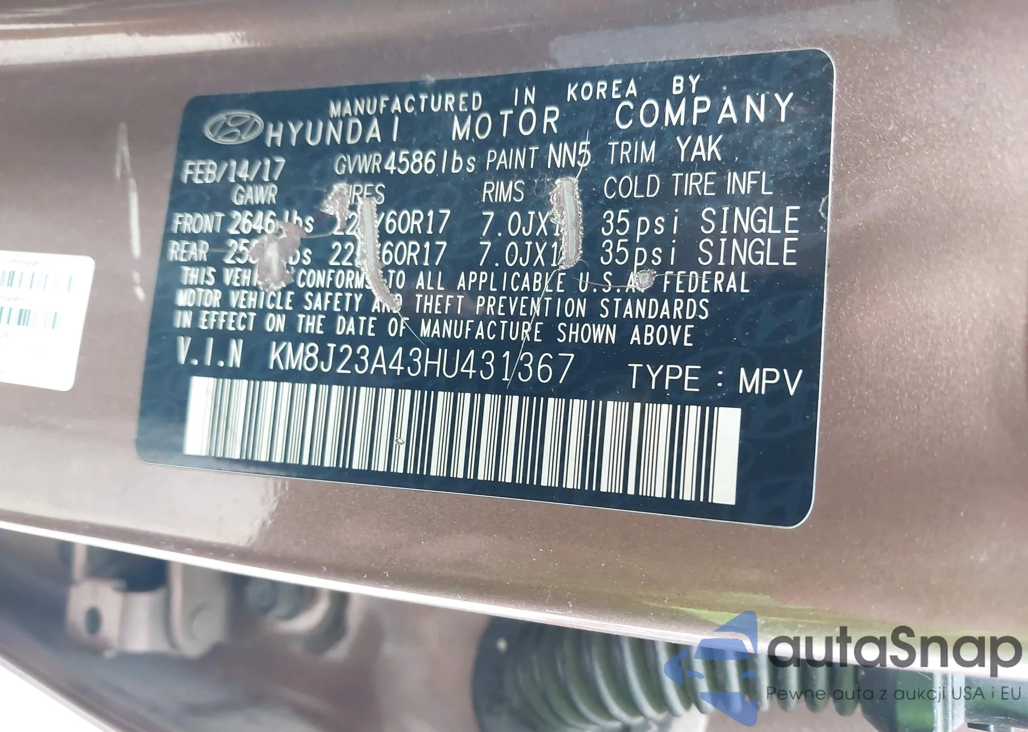 • VIN KM8J23A43HU431367