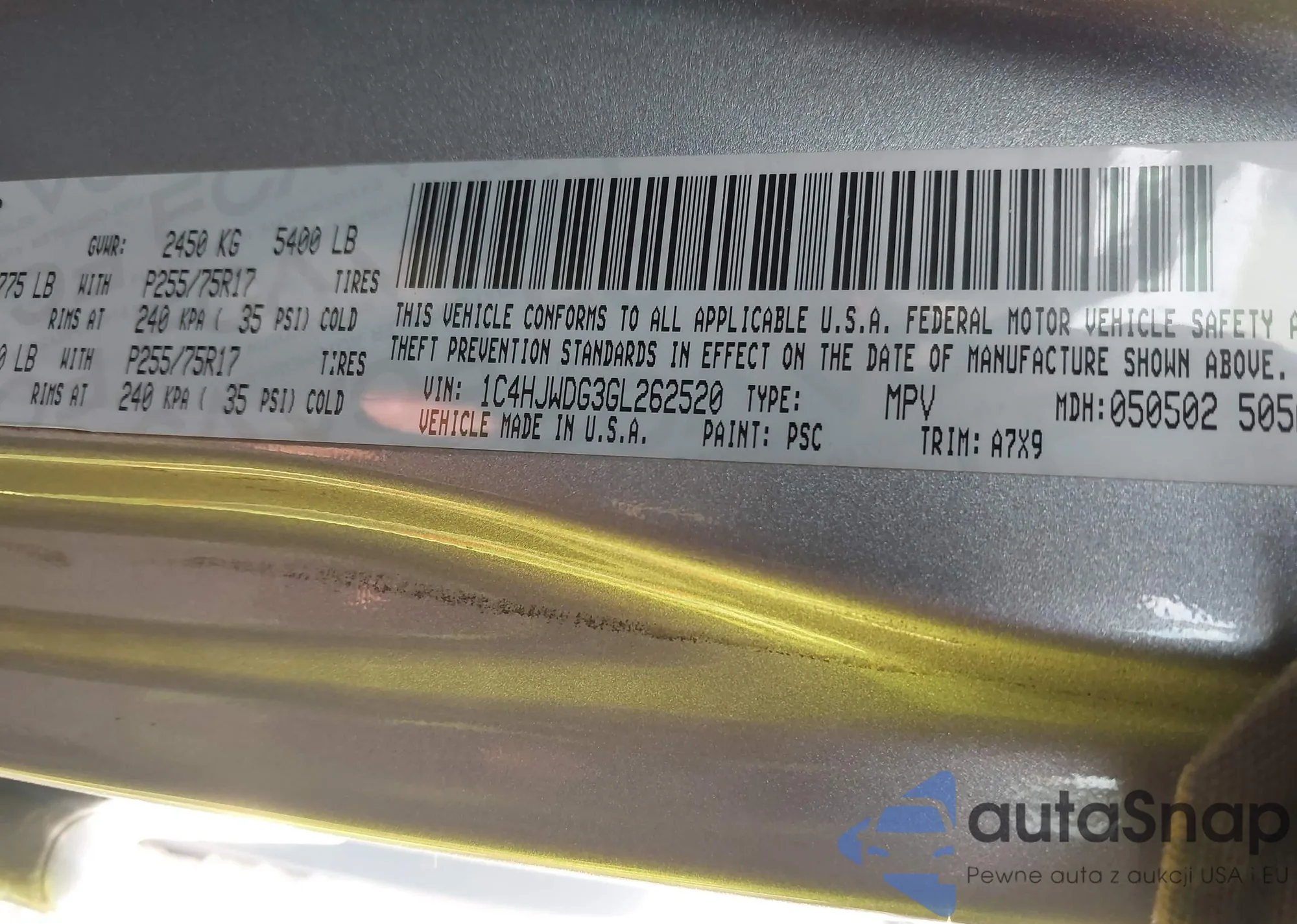 • VIN 1C4HJWDG3GL262520