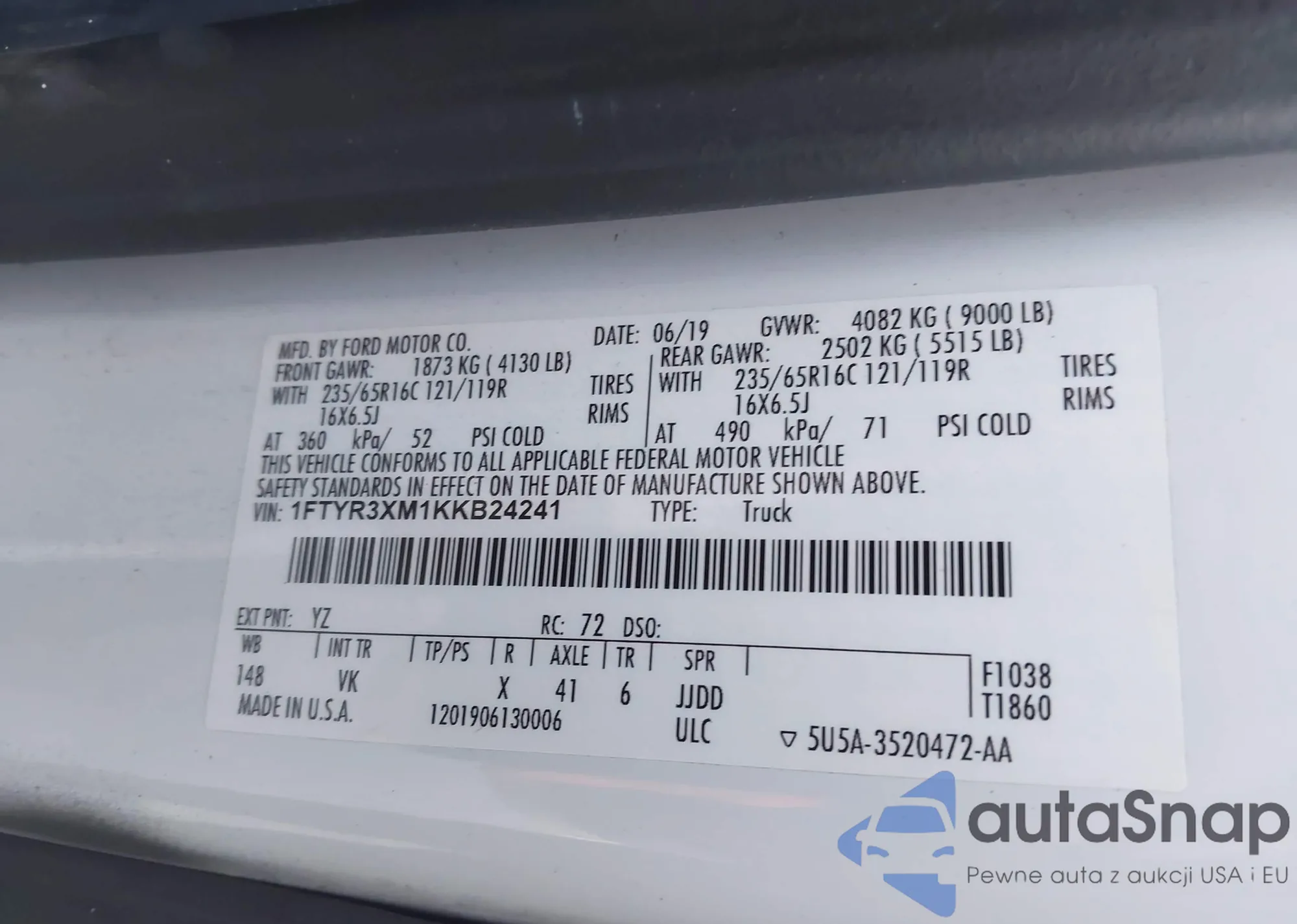 • VIN 1FTYR3XM1KKB24241