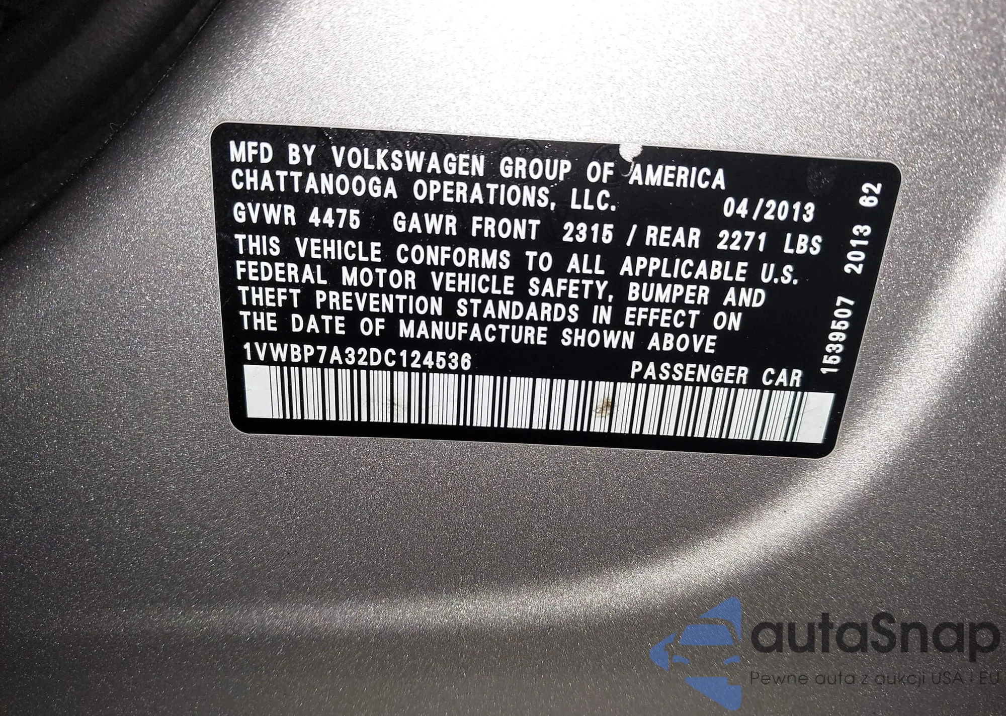 LOT: 43628323 VIN: 1VWBP7A32DC124536
