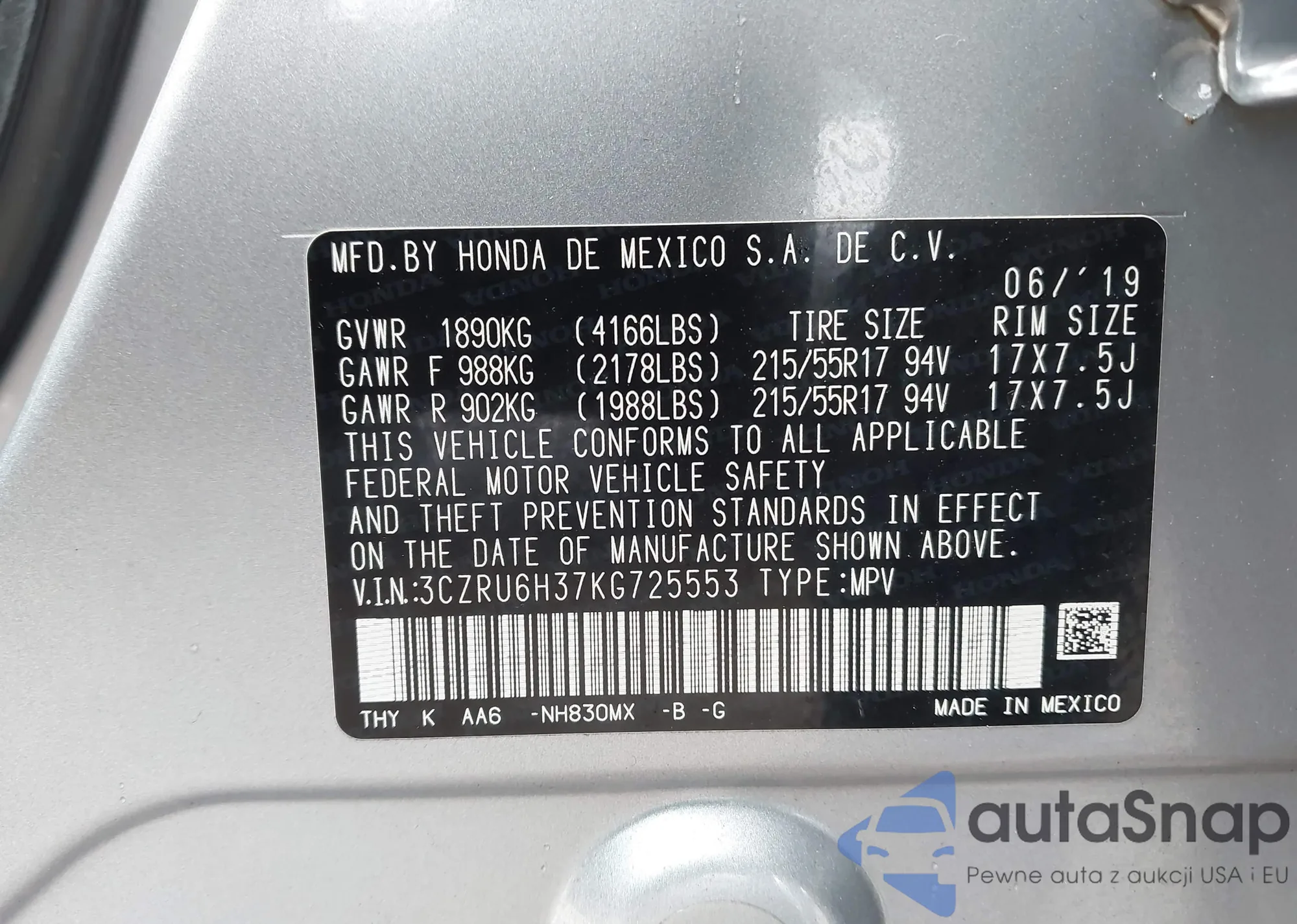 LOT: 43453206 VIN: 1HGCY2F5XRA075401
