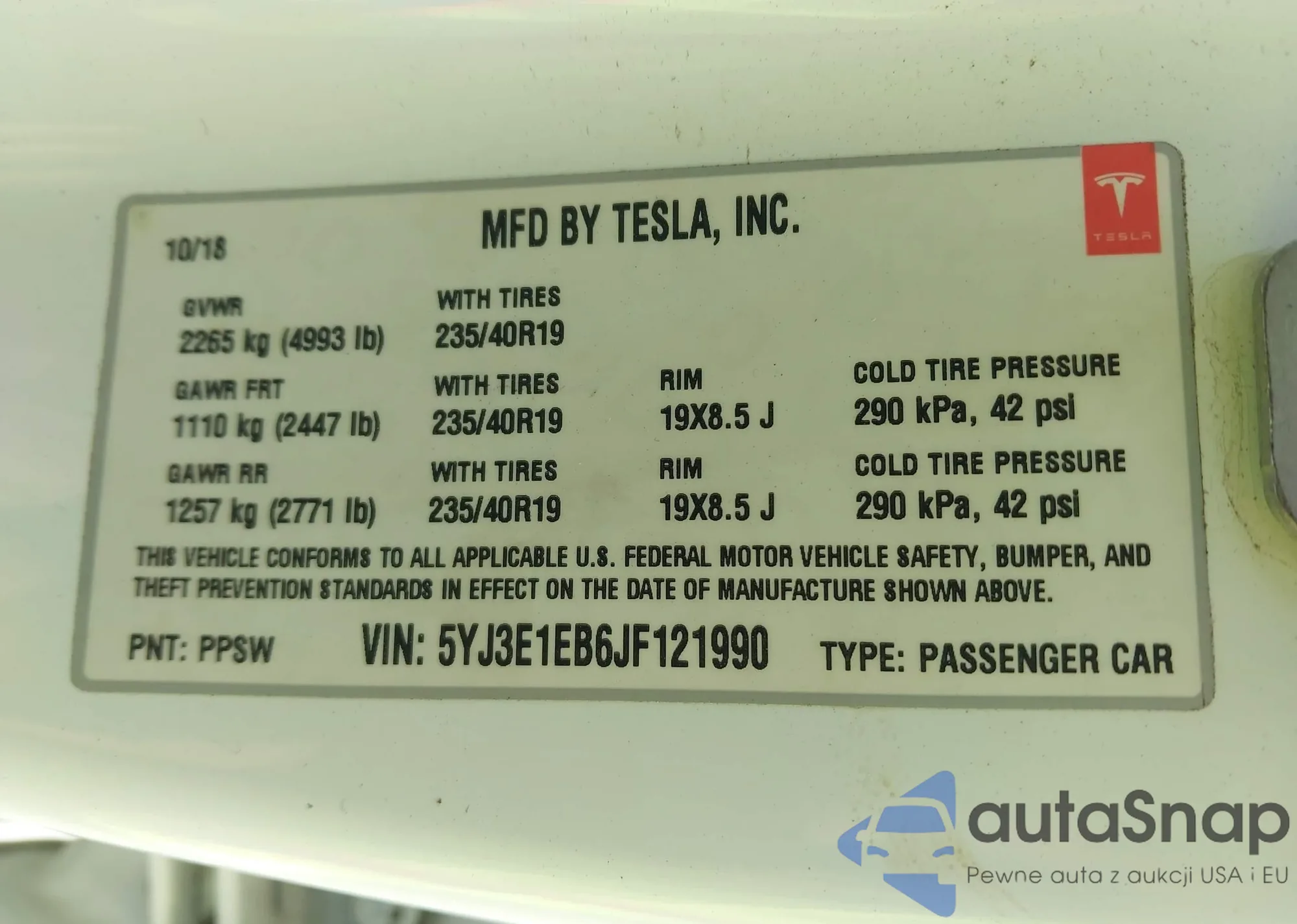 • VIN 5YJ3E1EB6JF121990