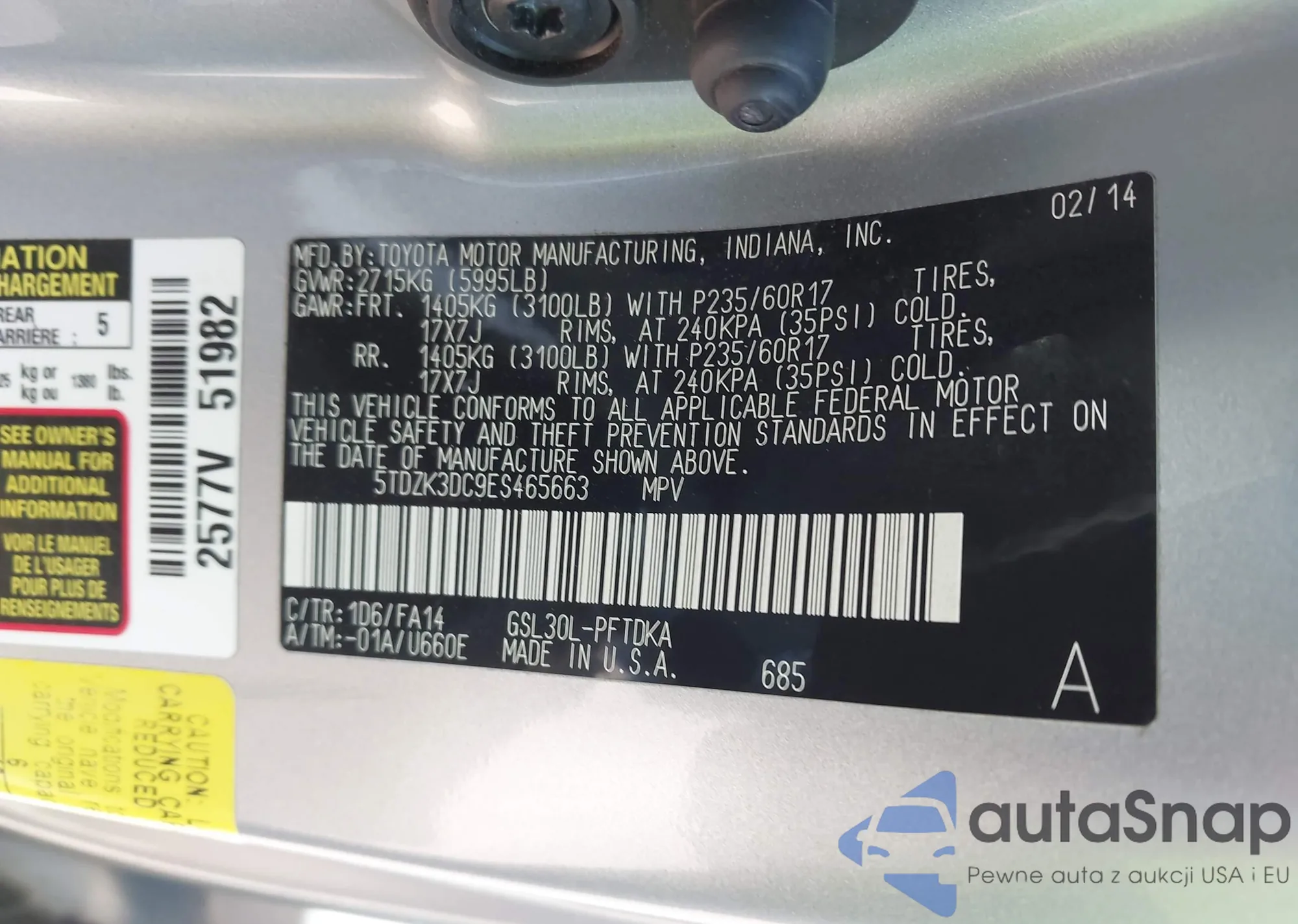 LOT: 43755883 VIN: 5TDZK3DC9ES465663