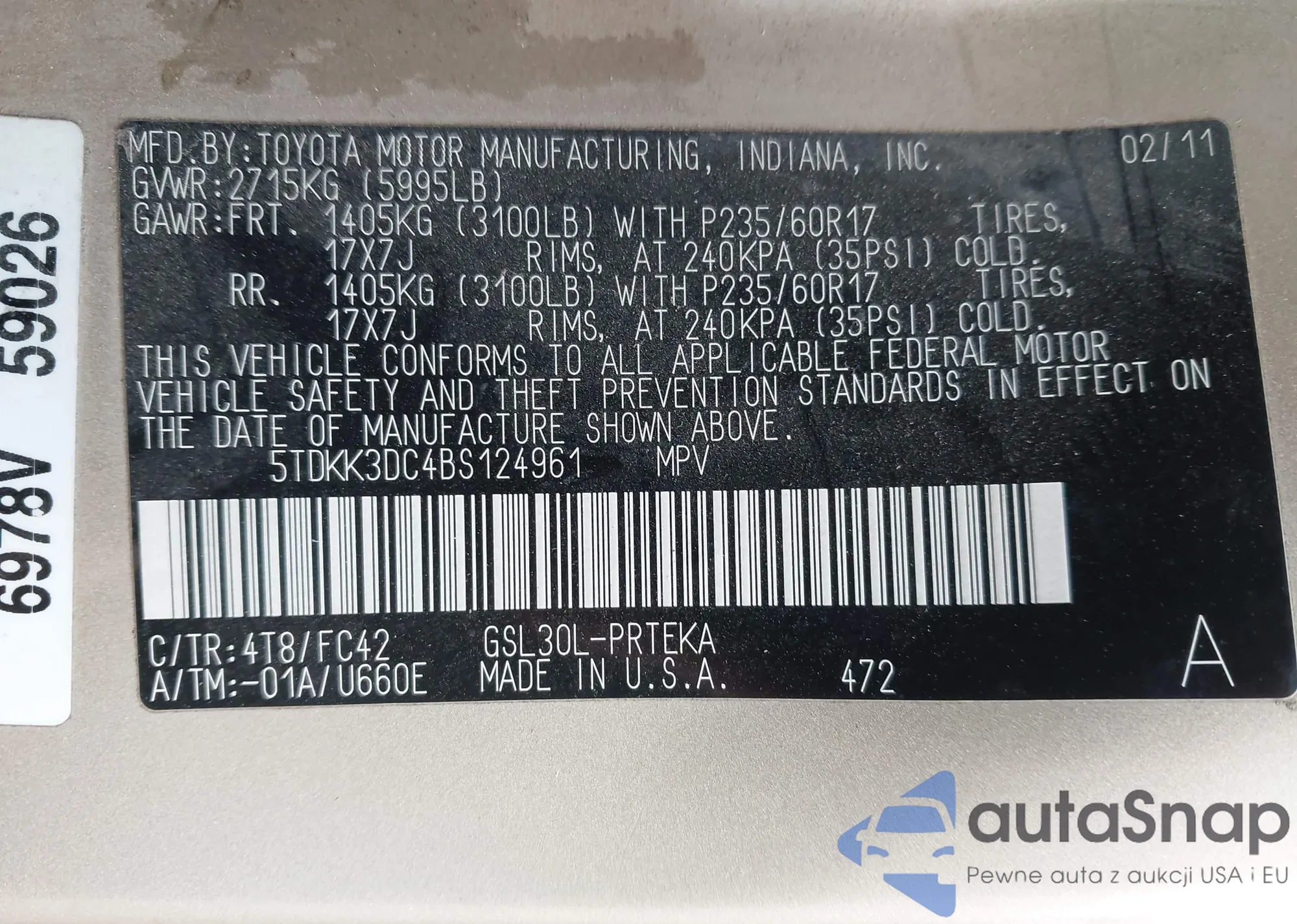 LOT: 43722305 VIN: 5TDKK3DC4BS124961