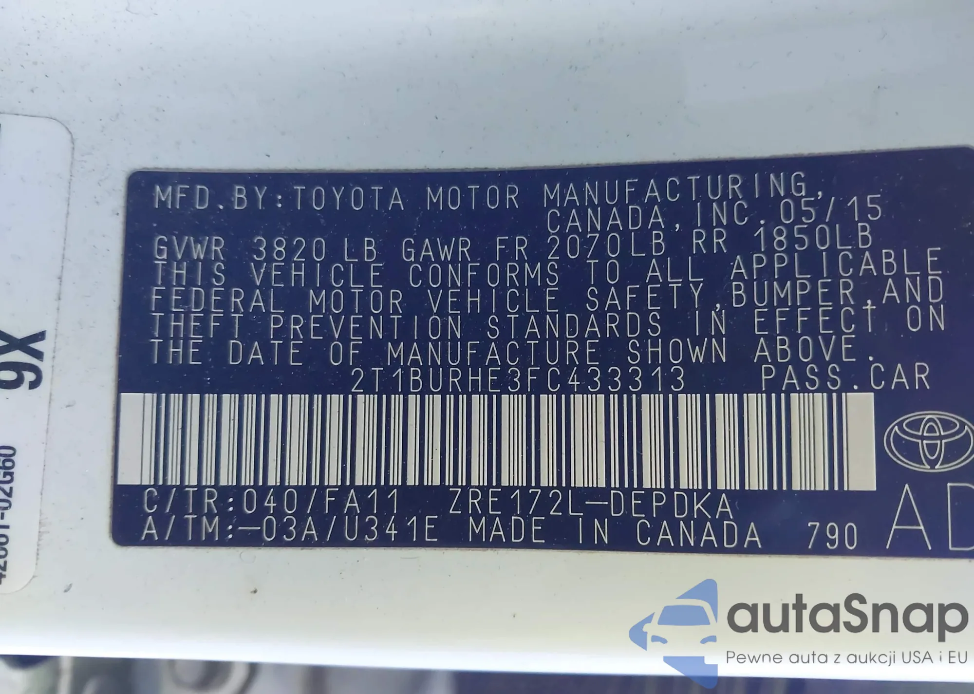 • VIN 2T1BURHE3FC433313
