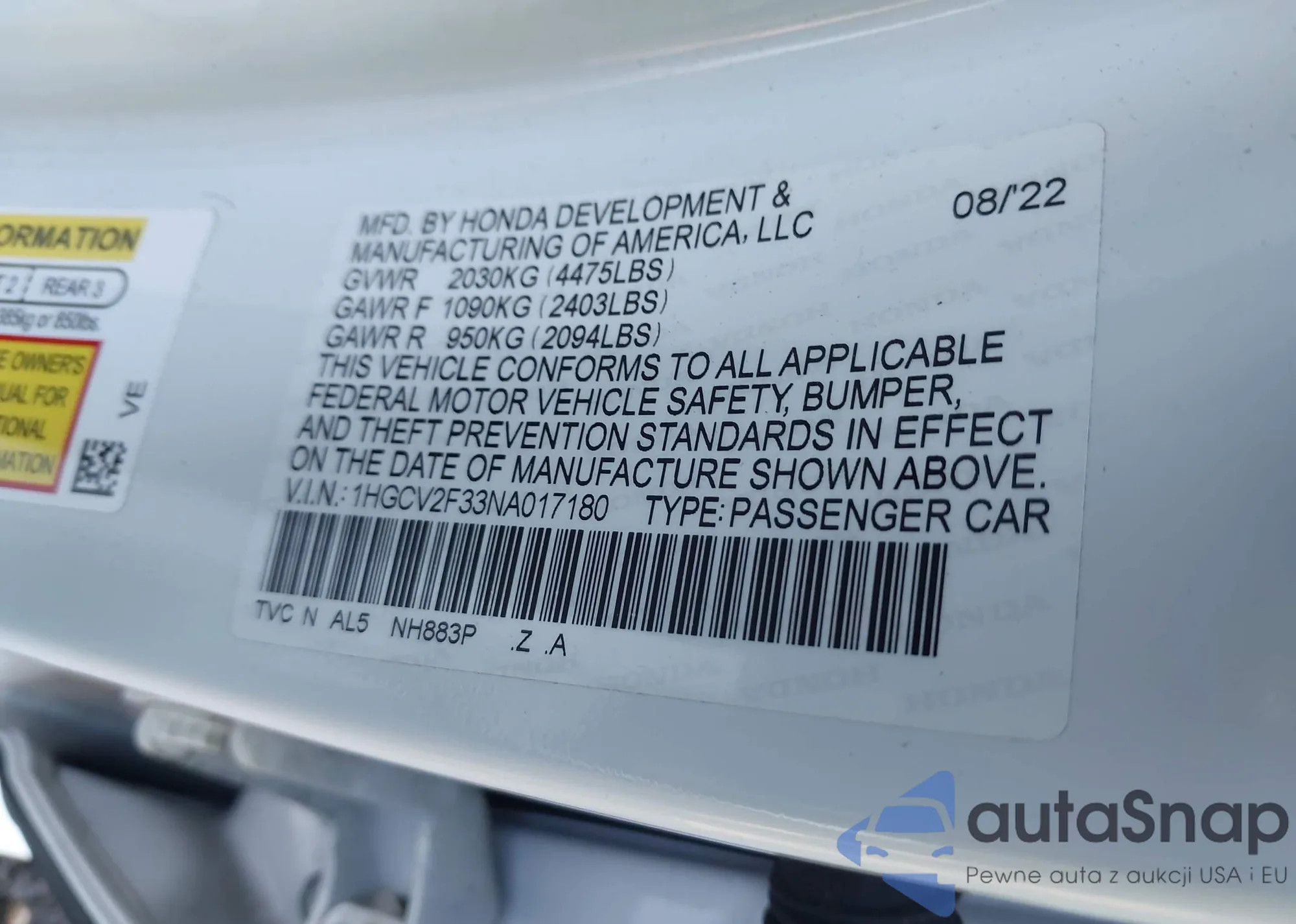 • VIN 1HGCV2F33NA017180