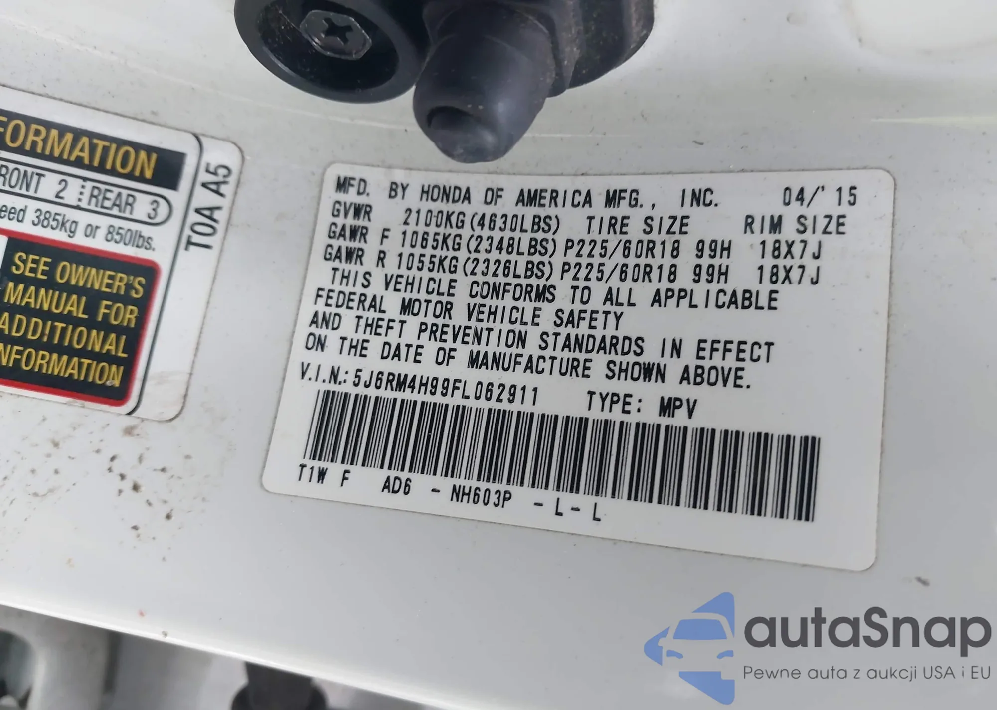 • VIN 5J6RM4H99FL062911