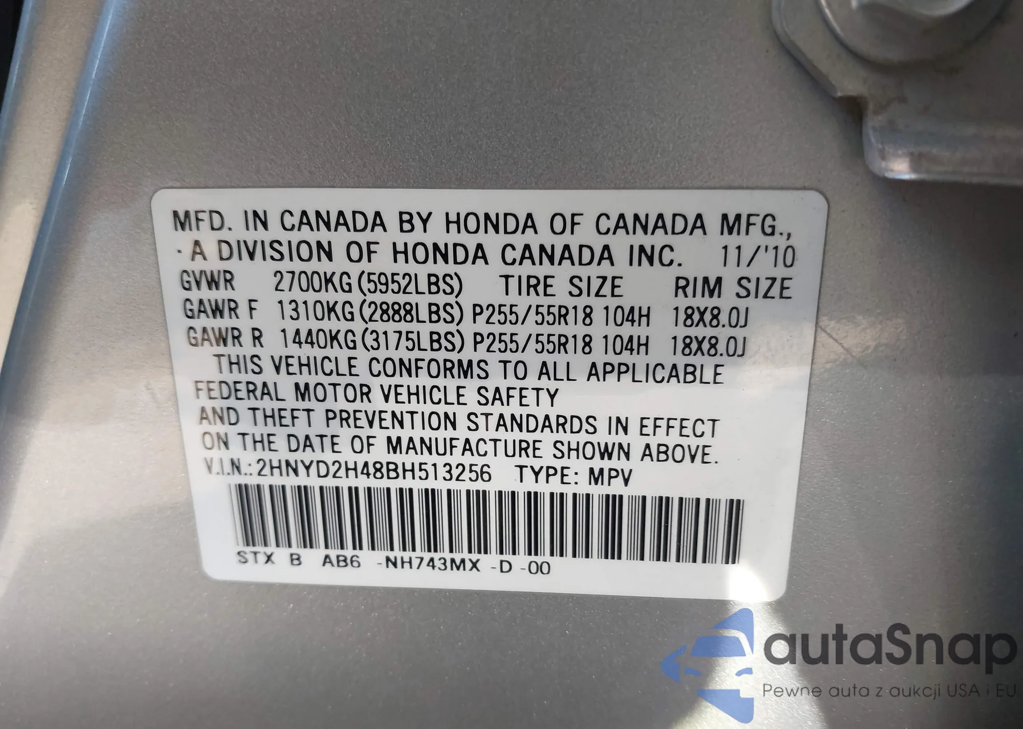 LOT: 43785642 VIN: 2HNYD2H48BH513256