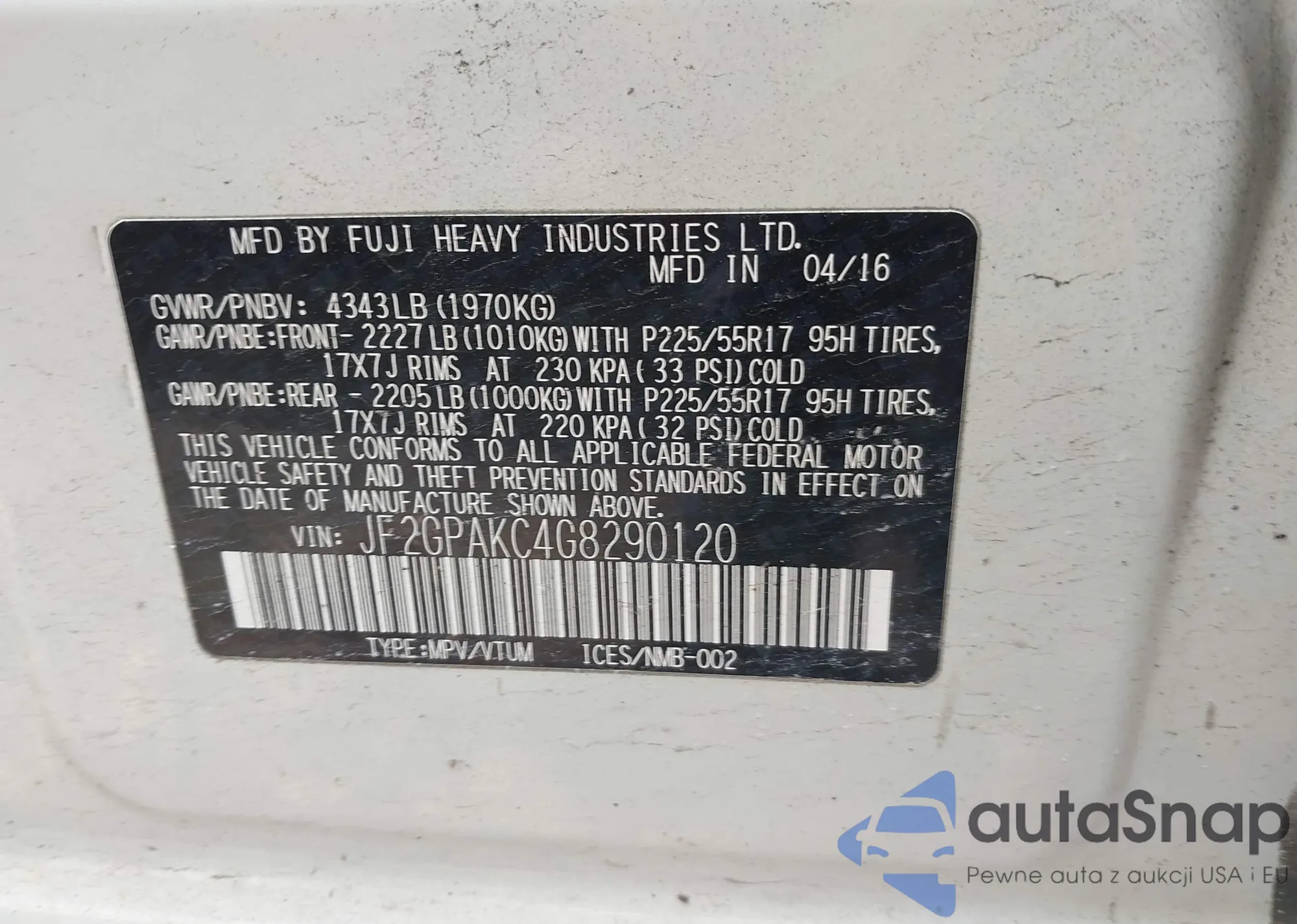 LOT: 43717656 VIN: JF2GPAKC4G8290120